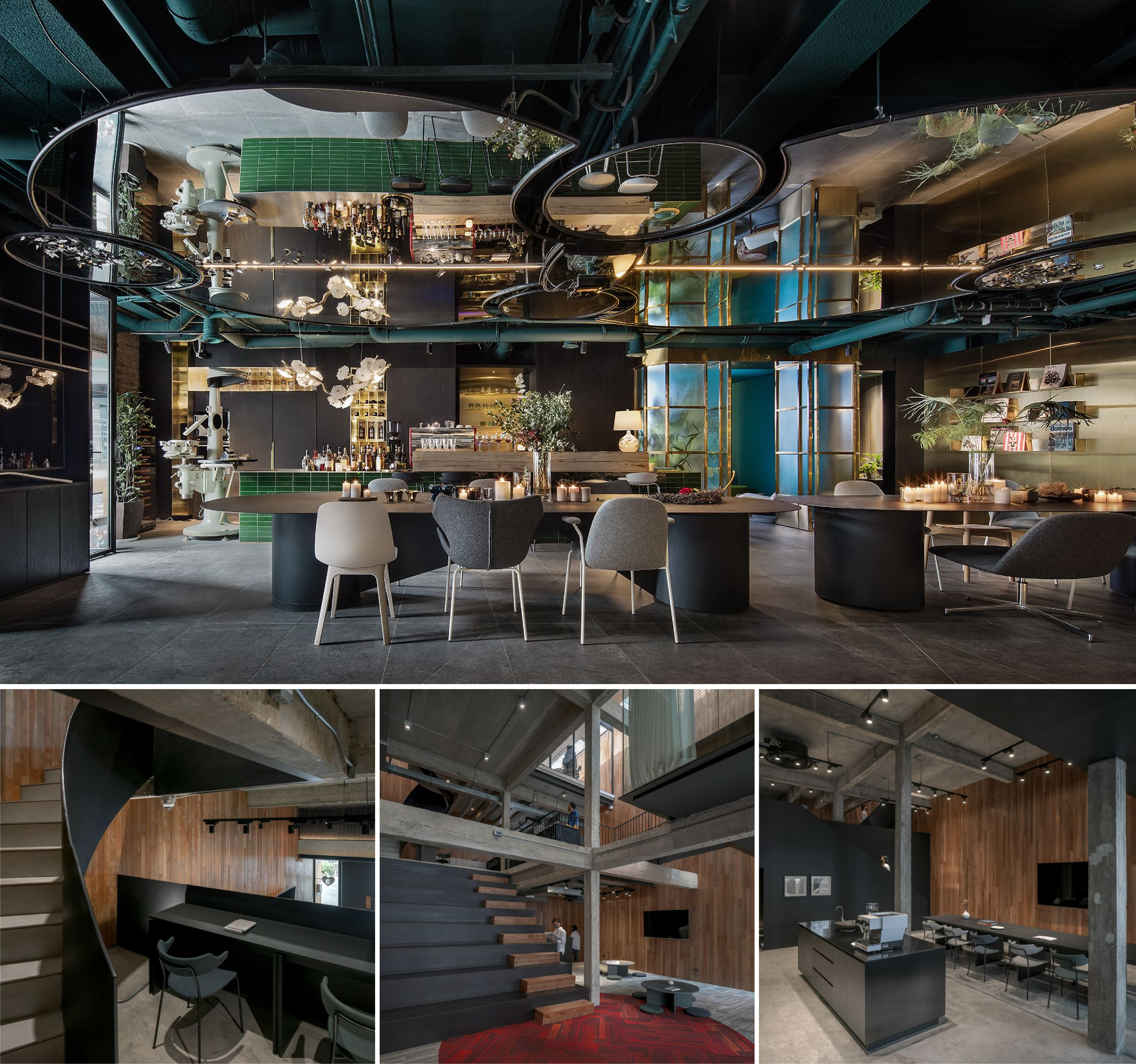 GRADO risks eccentric interior designs and wonders whether it could be a custom norm for the minorities of Gen Z to immerse in cyberpunk aesthetics tinged with industrial "basement" style, as it seems we have unlocked some indie potential through Baksters and Cun design studio. Raw edges with little surface treatment are fairly restrained with slim metal wires to alleviate visual roughness, yet the overwhelming dark tone across the canvas may still cause mental pressure. Therefore we assigned the sleek set of Wings, Every, and Bunny Chair at the reception hub, especially featuring the earthy hues to dilute the color density. However, while approaching the internal, an array of lightweight Mou Chairs in deep green and blue help avoid the boredom of lightlessness.