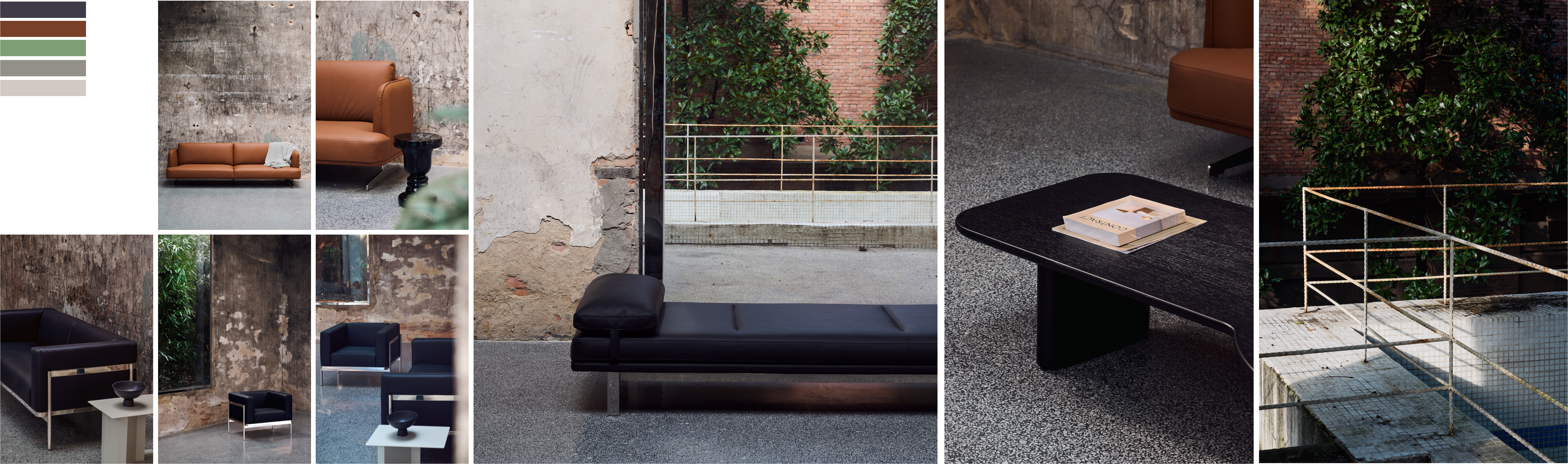 GRADO's depiction of industrial vulnerability in the Spring 2024 theme resonates with exposing outdated production modes from within, reminiscent of a scene featuring a torn wall and faint rust stains. To contrast this aged industrial backdrop, GRADO introduces a collection of modern, sleek, dark-toned, and leathery furniture pieces like the BENTO Sofa, Gondola Sofa, and Wayne lounge chair that take a prominent position in the interior setting. These contemporary pieces serve as focal points, adding a touch of sophistication and elegance to the space.