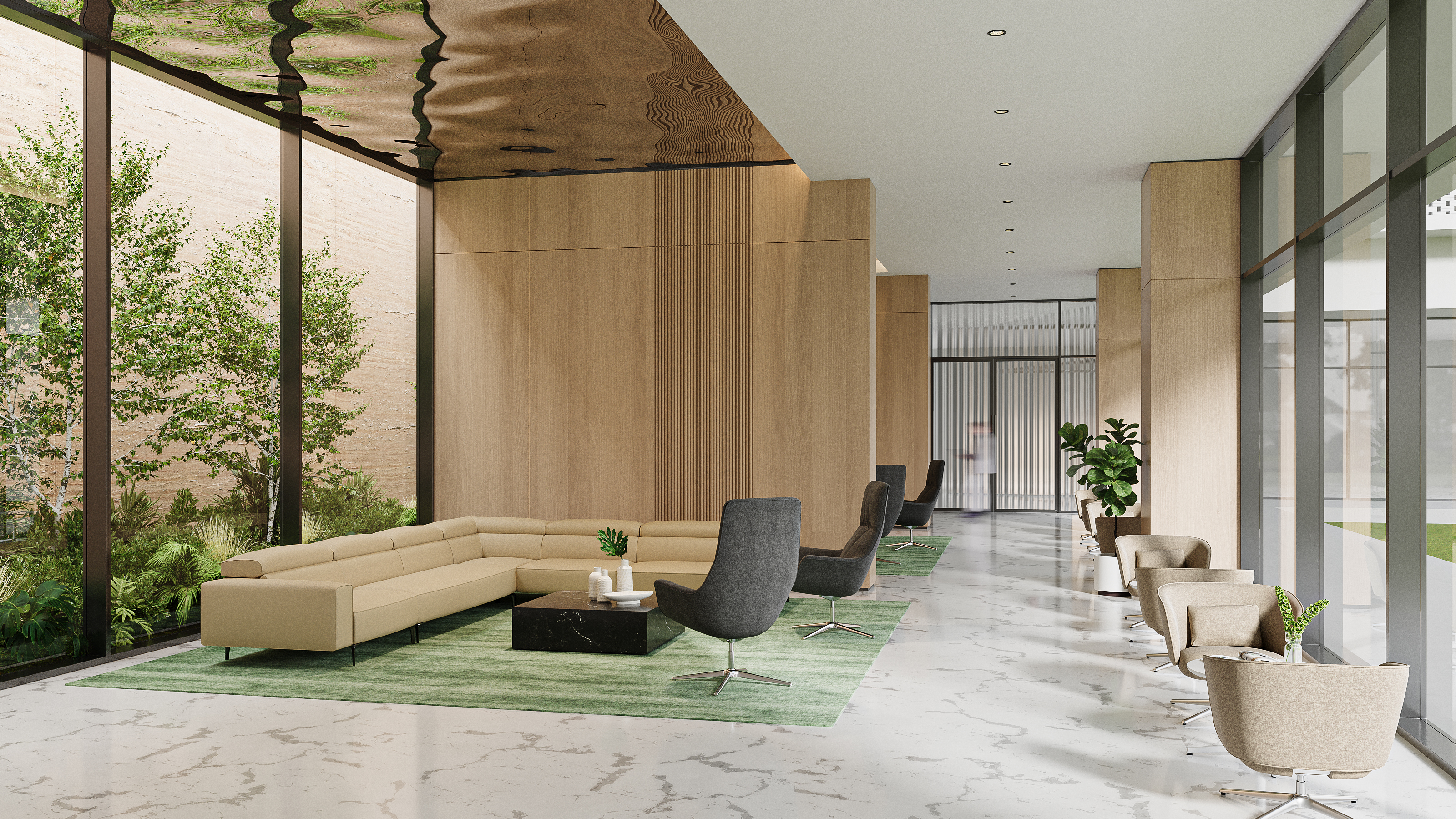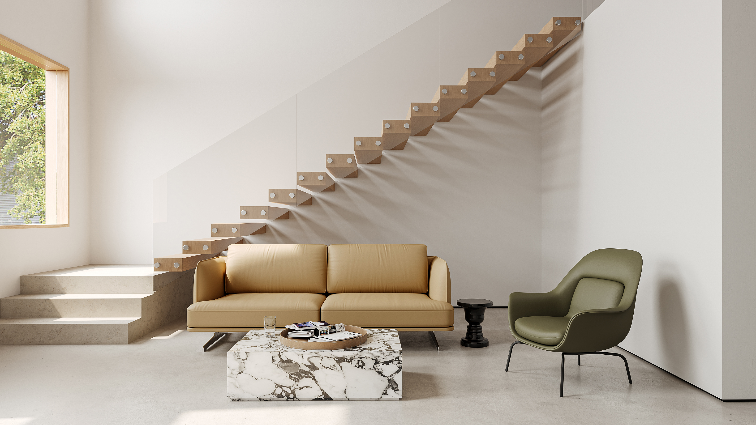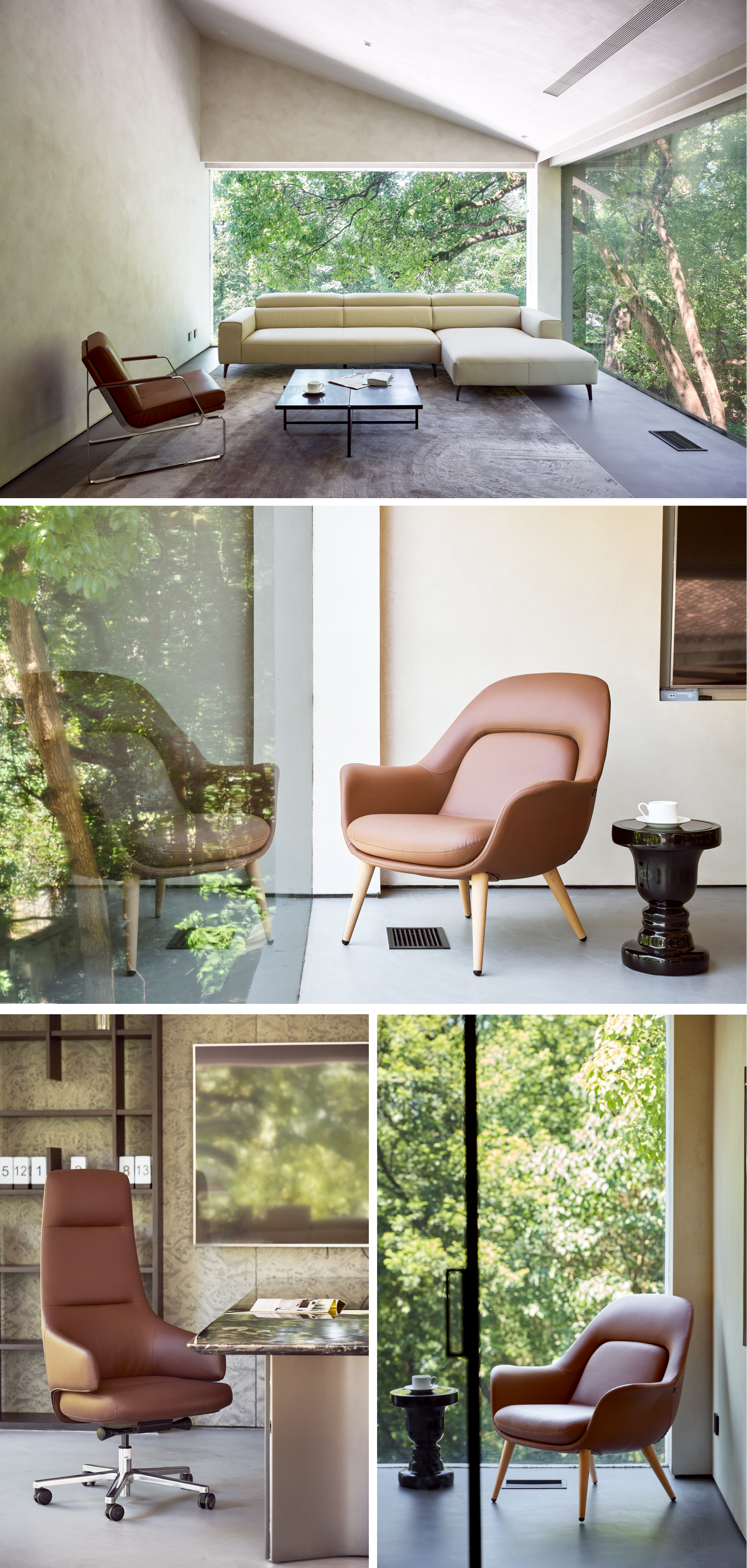 In another year of heat-hit summer, we self-drive the beat-the-heat suite to the countryside where fewer workaholics ask to stick around in an air-conditioned environment. We mindfully pick out sweat-proof and easy-clean furnishings comfortable for long-time lounging and lying as well as placing in high-temperature conditions. Considering applying to different use scenarios including visiting space, queuing space, conversation space, and manager room, we ensure the possibility to connect separate modules, and flexibly move around the corner Multiple color options such as ivory white and chestnut brown are highly recommended to cover top-notch leathery shells. As seen, the Ava Sofa in off-white offers a streamlined and comfortable seating experience, fostering an excellent sense of relaxation. The unique design and warm brown tones of the Locus Chair and Fly Lounge Chair add an elegant and warm touch to the space, creating a fresh and vibrant ambiance when illuminated by natural light. The verdant trees outside cast shade and bring the beauty of nature indoors, allowing one to experience the outdoors even in the heat. Whether it's solitary leisure time or gatherings with loved ones, this furniture set is an ideal choice.