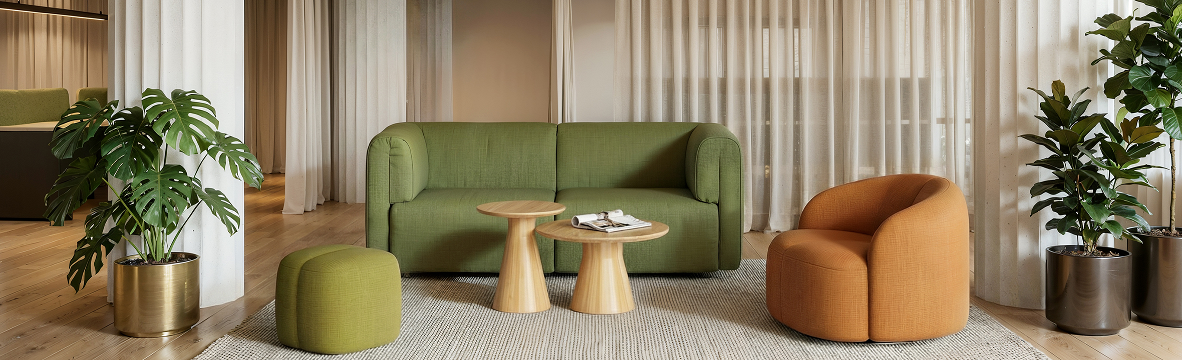 When paired with poufs, the Twin Lounge Chair can be combined to create flexible waiting, social, or short-stay lounge areas. Compared with fixed sofa layouts, this configuration is lighter, easier to adjust, and can be re-planned at any time according to traffic flow and changing needs.