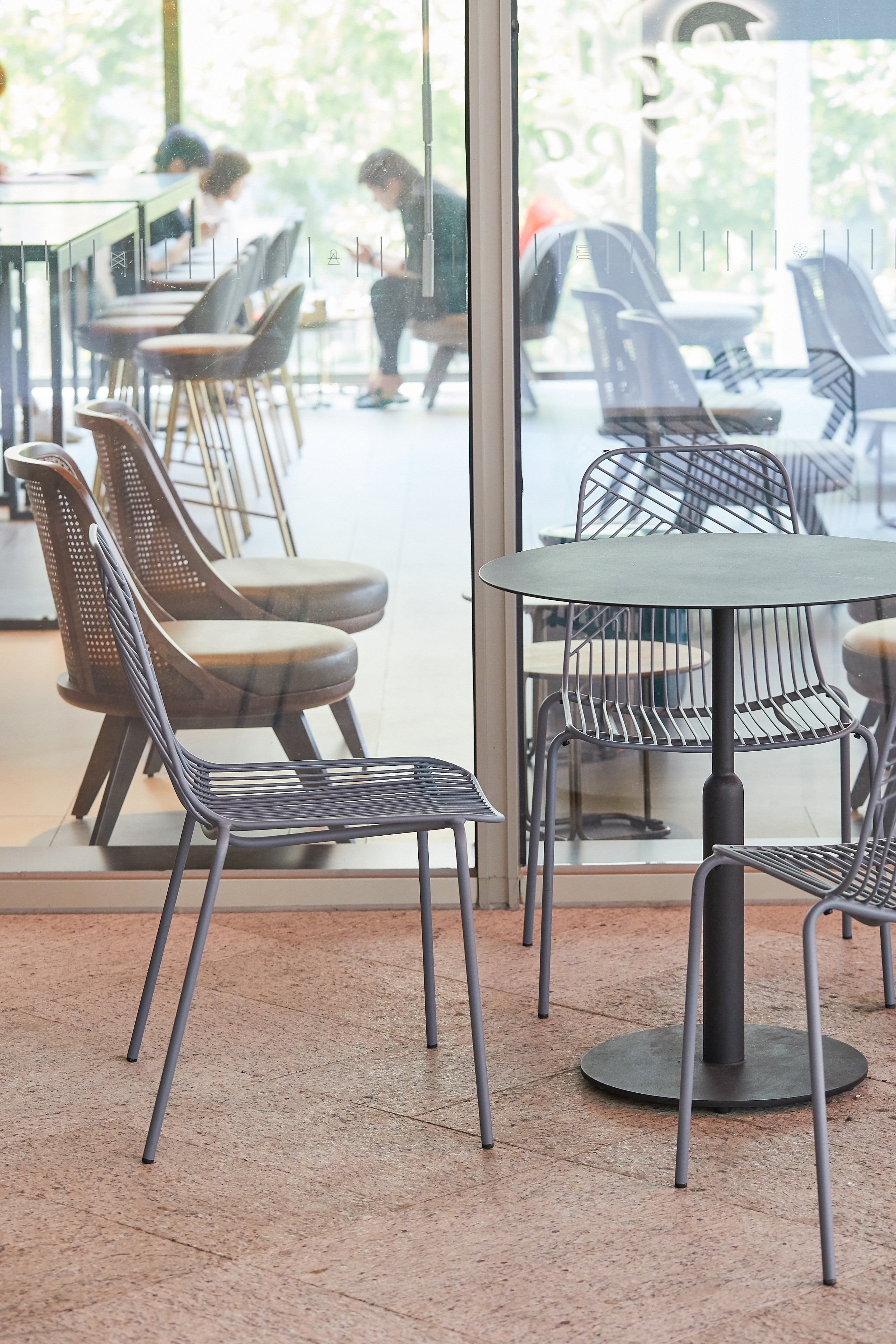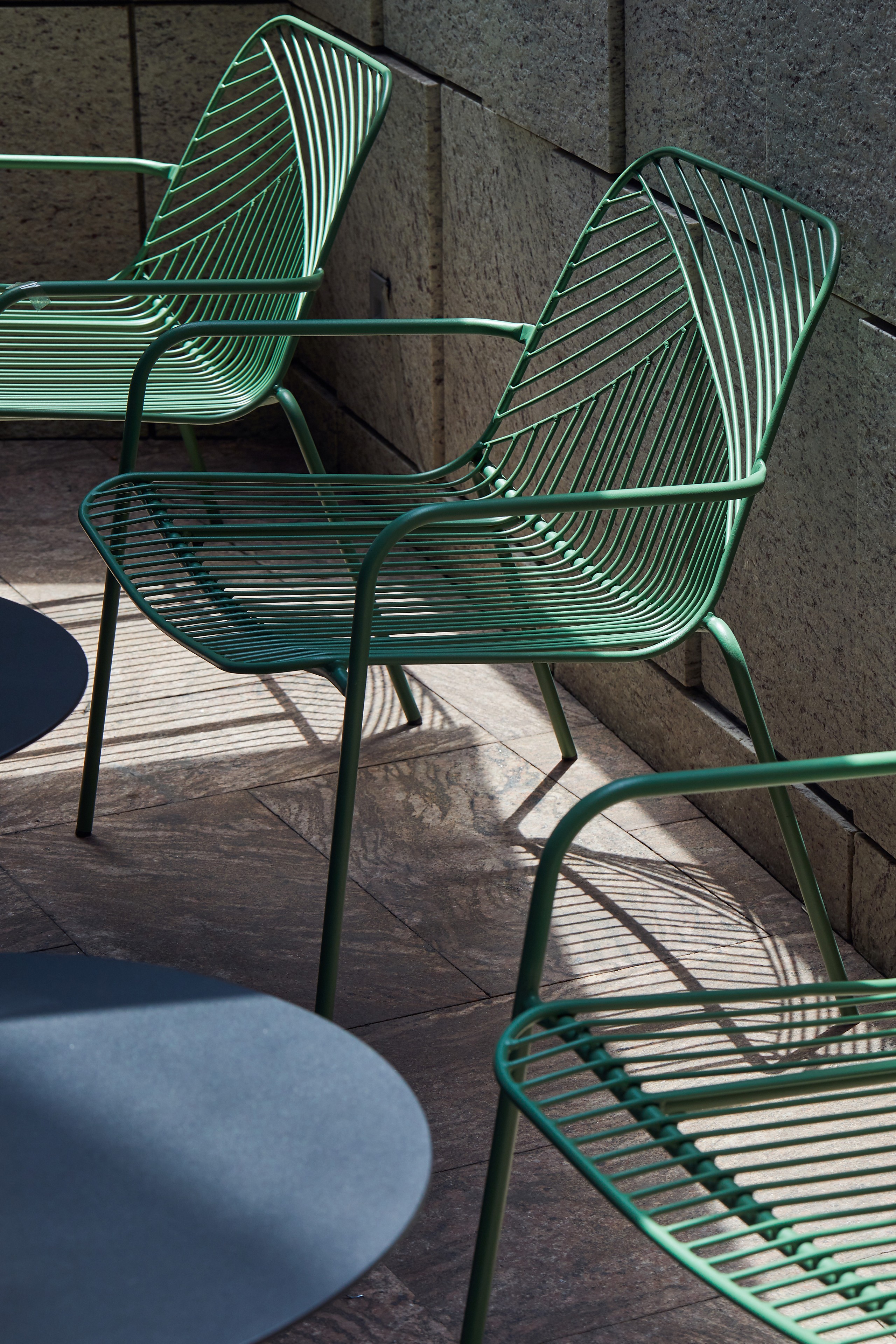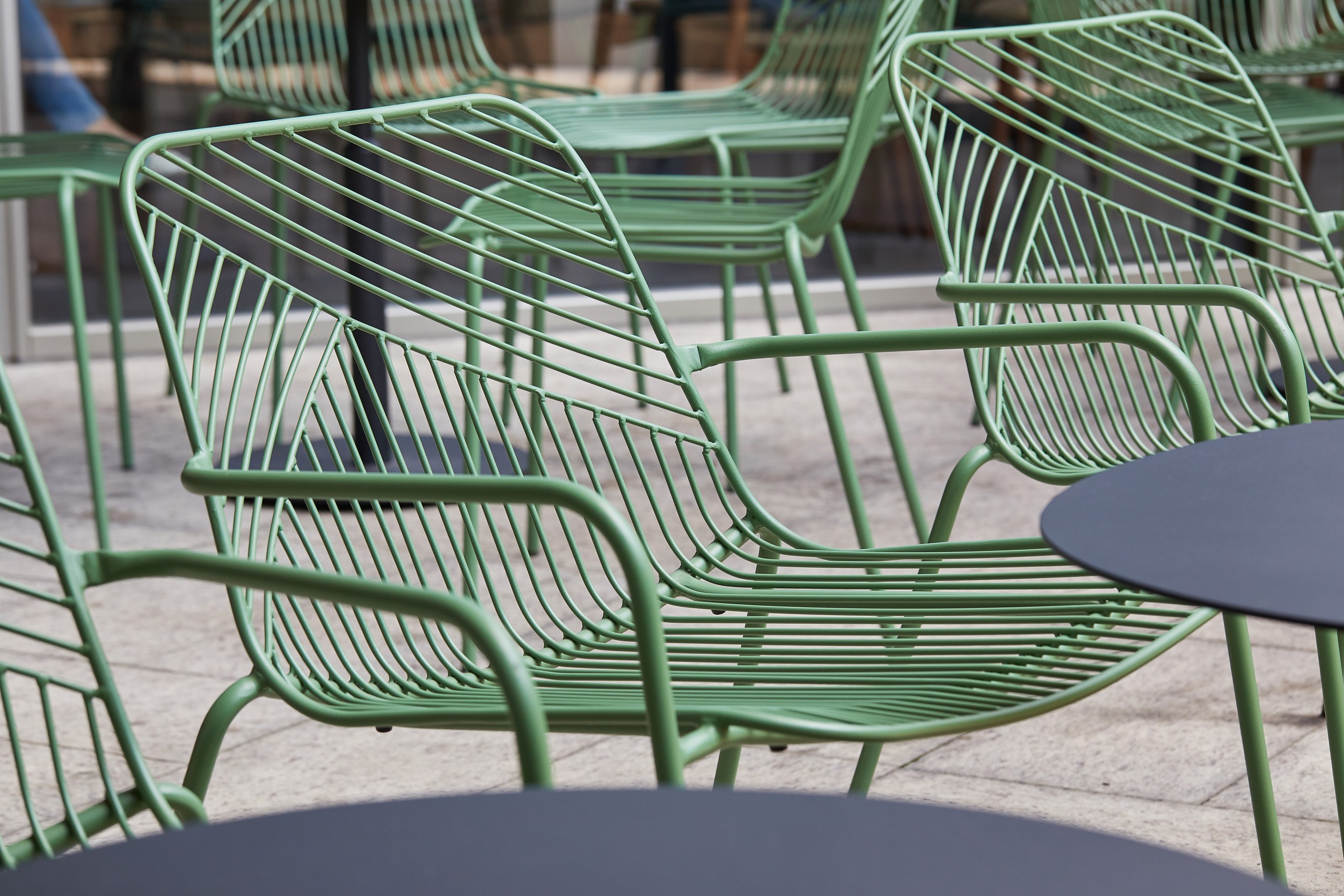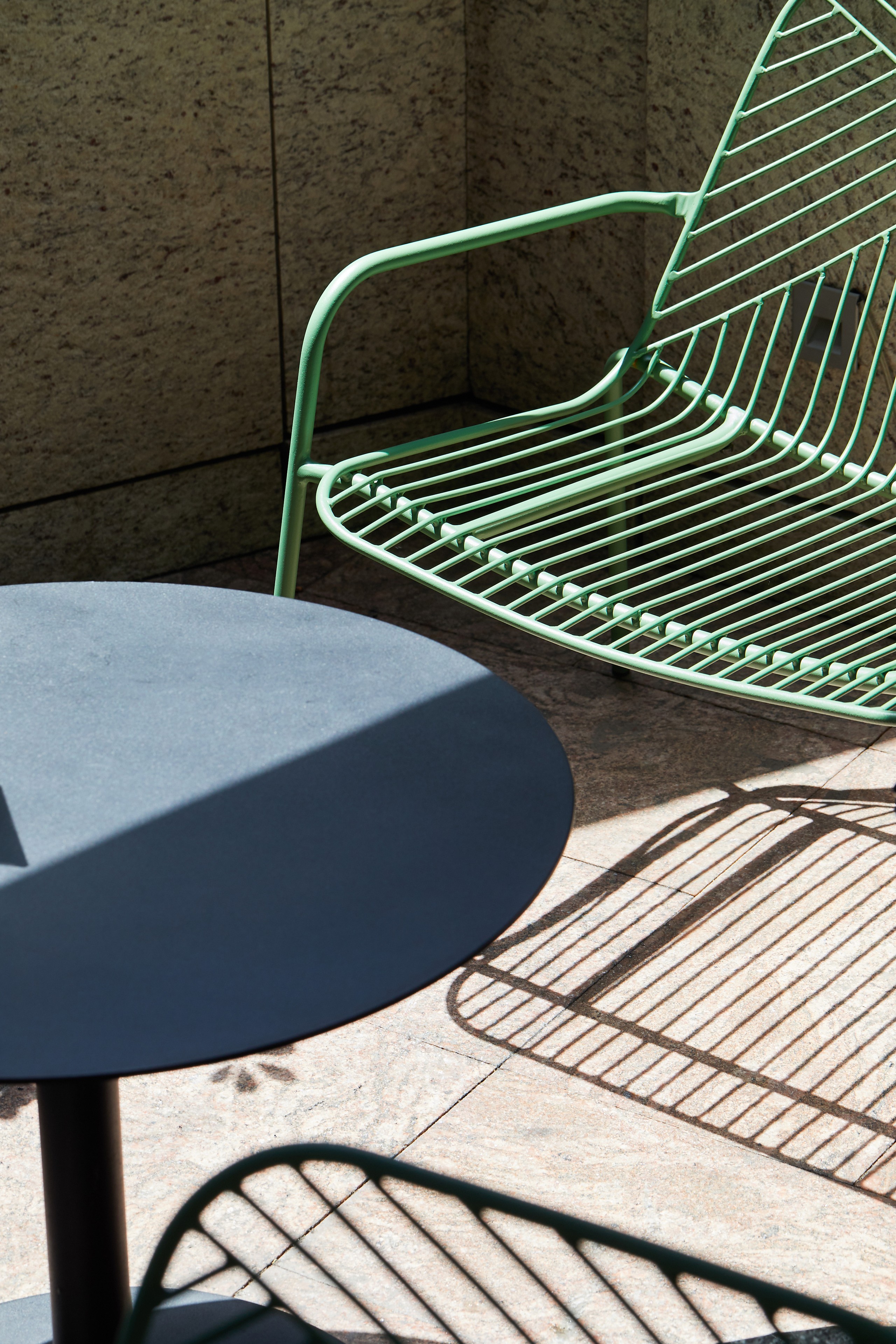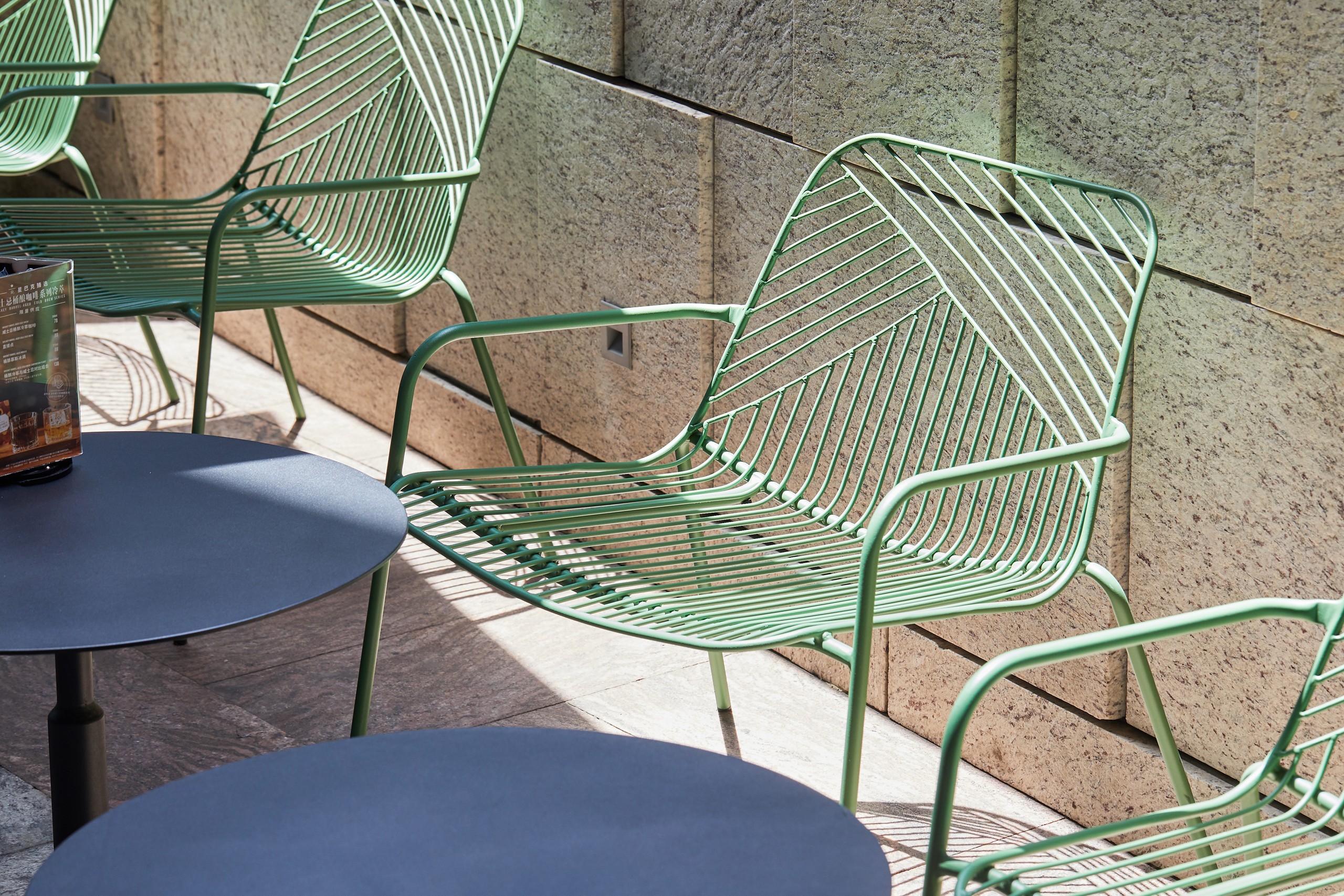 As the top sale global coffee brand, Starbucks shops almost serve as significant landmarks in cities throughout the world. With its fair price and convenient service, Starbucks respond to a city’s realities on chaotic urban living and utilitarian manner, as well as the leisure time in between. For this Starbucks shop exterior area, grado’s Sketch Lounge Chair took fully advantages of the outdoor environment. Sunshine goes through Sketch Lounge Chair’s steel tubes, artfully creating beautiful shadow onto the floor; sunshine baths Sketch Lounge Chair, naturally dying its original single color into shades of green. In this way, artistic designs are made around the clock by the force of nature. The sun and water-resistant Sketch Lounge Chair was designed for worry-free outside placement. While the chair’s modern aesthetic design echos its urban neighbourhood.