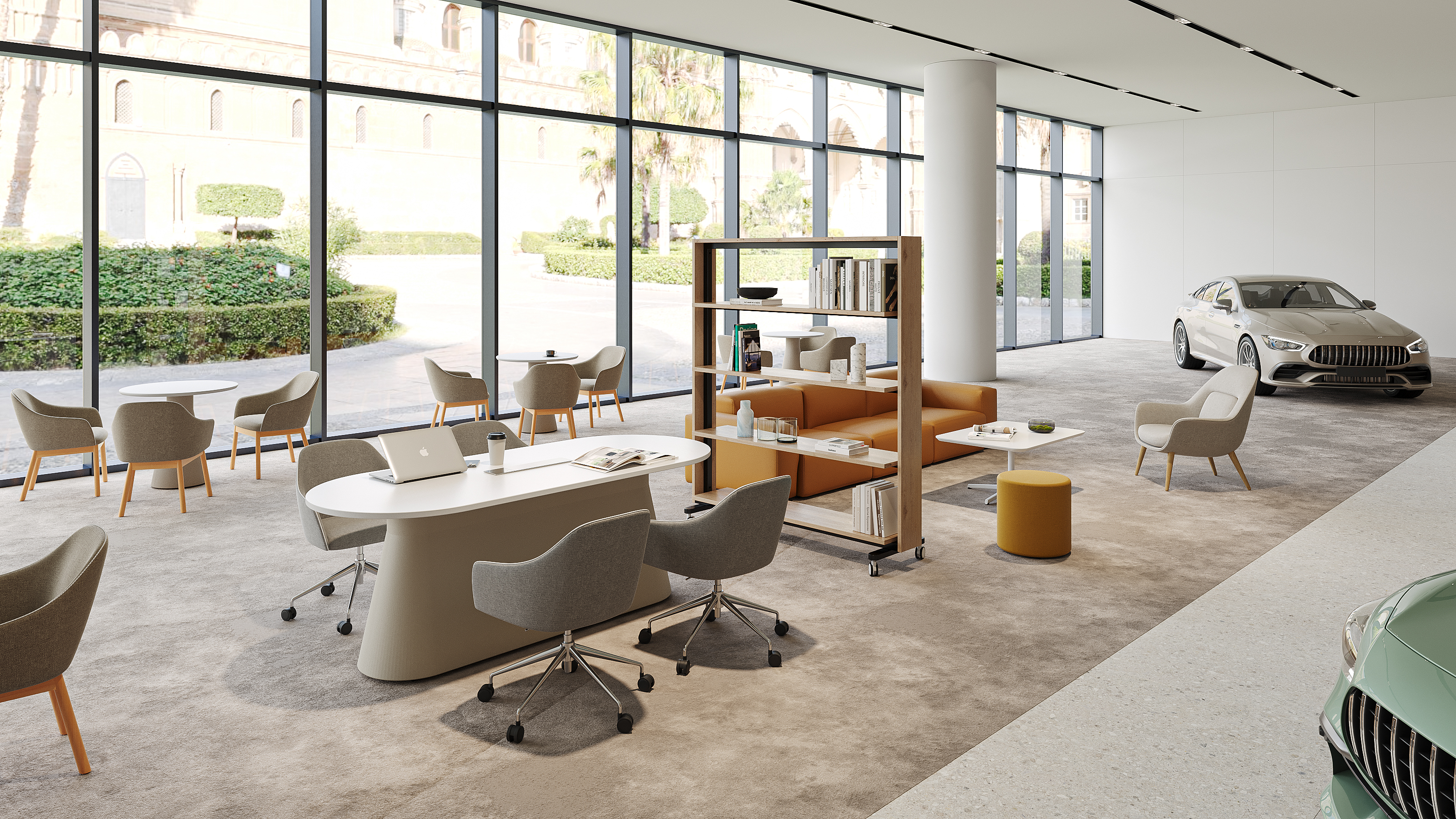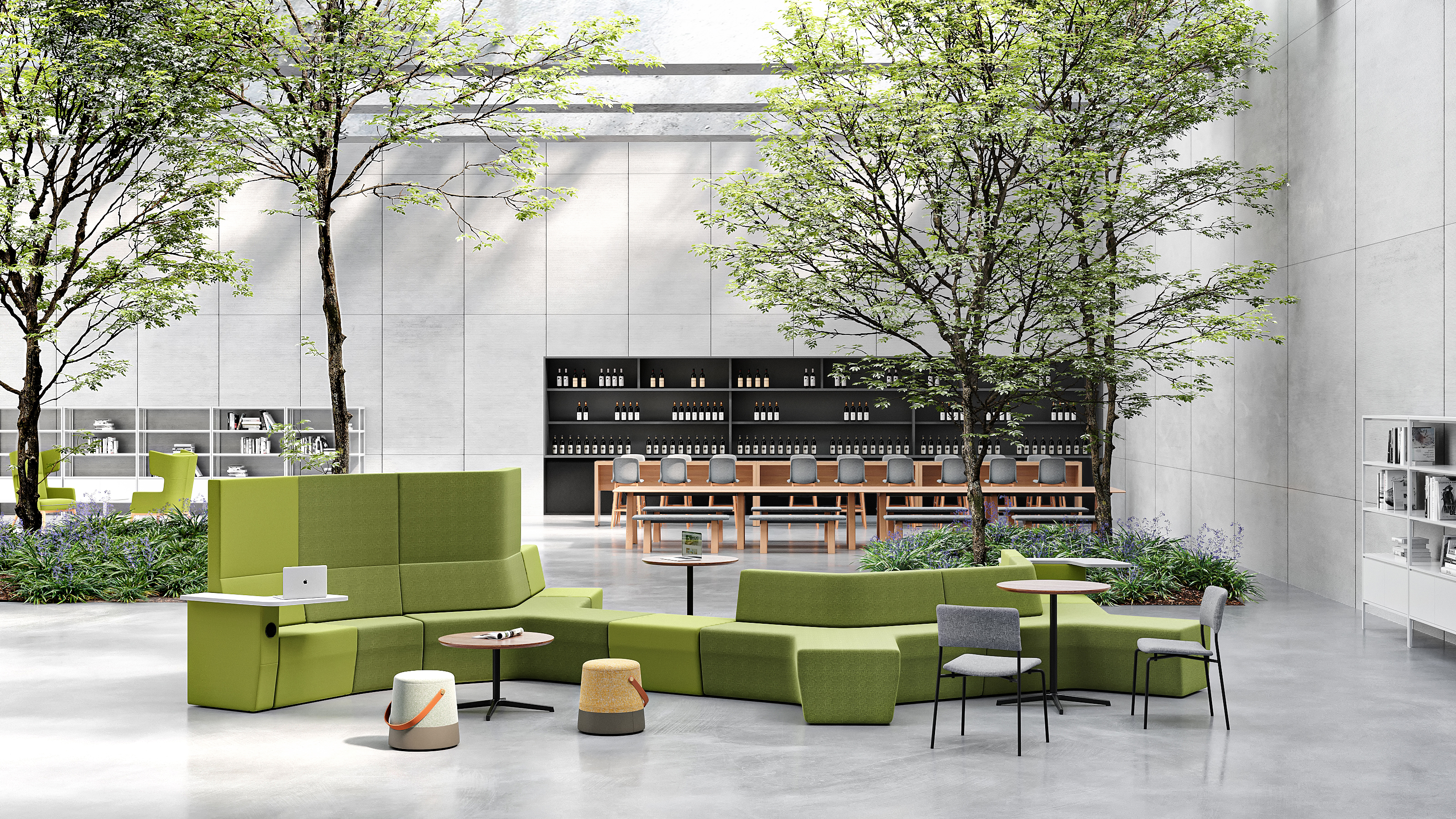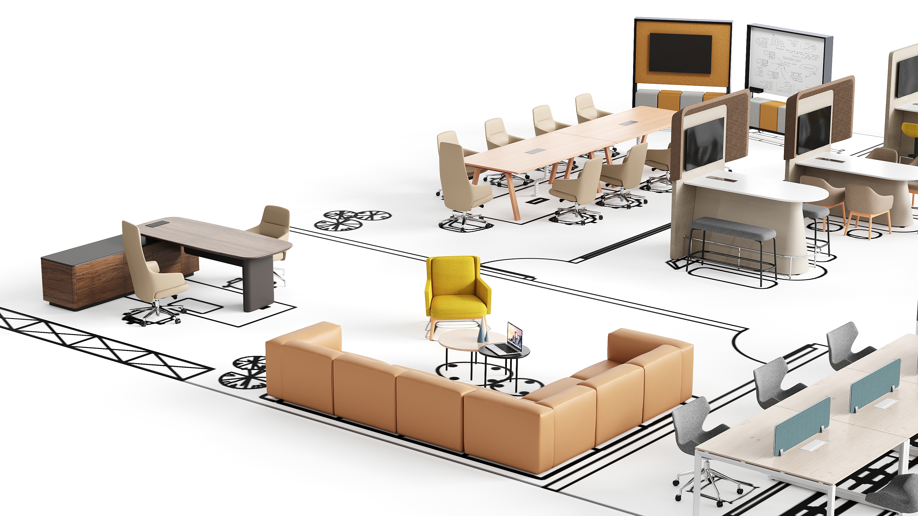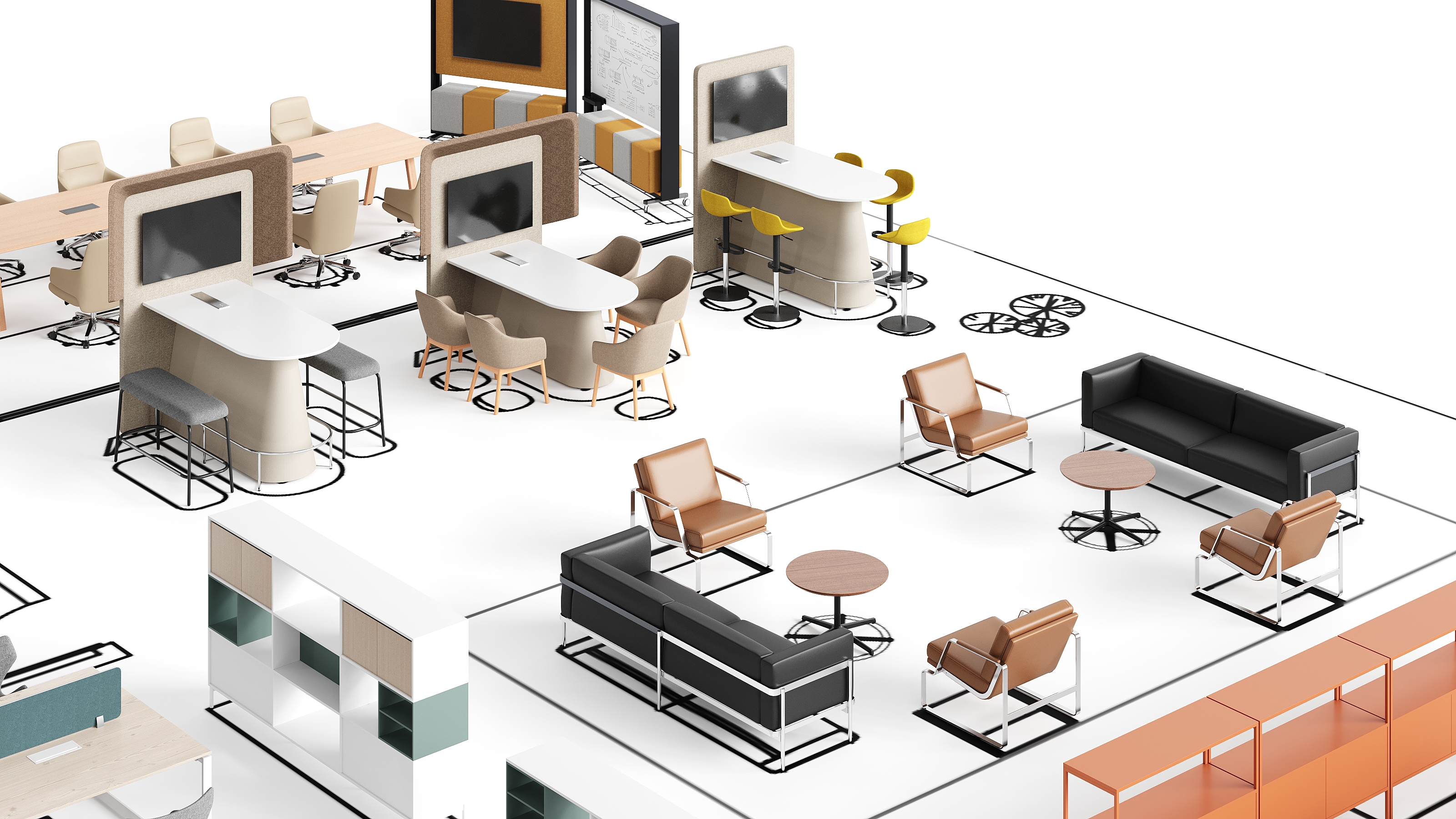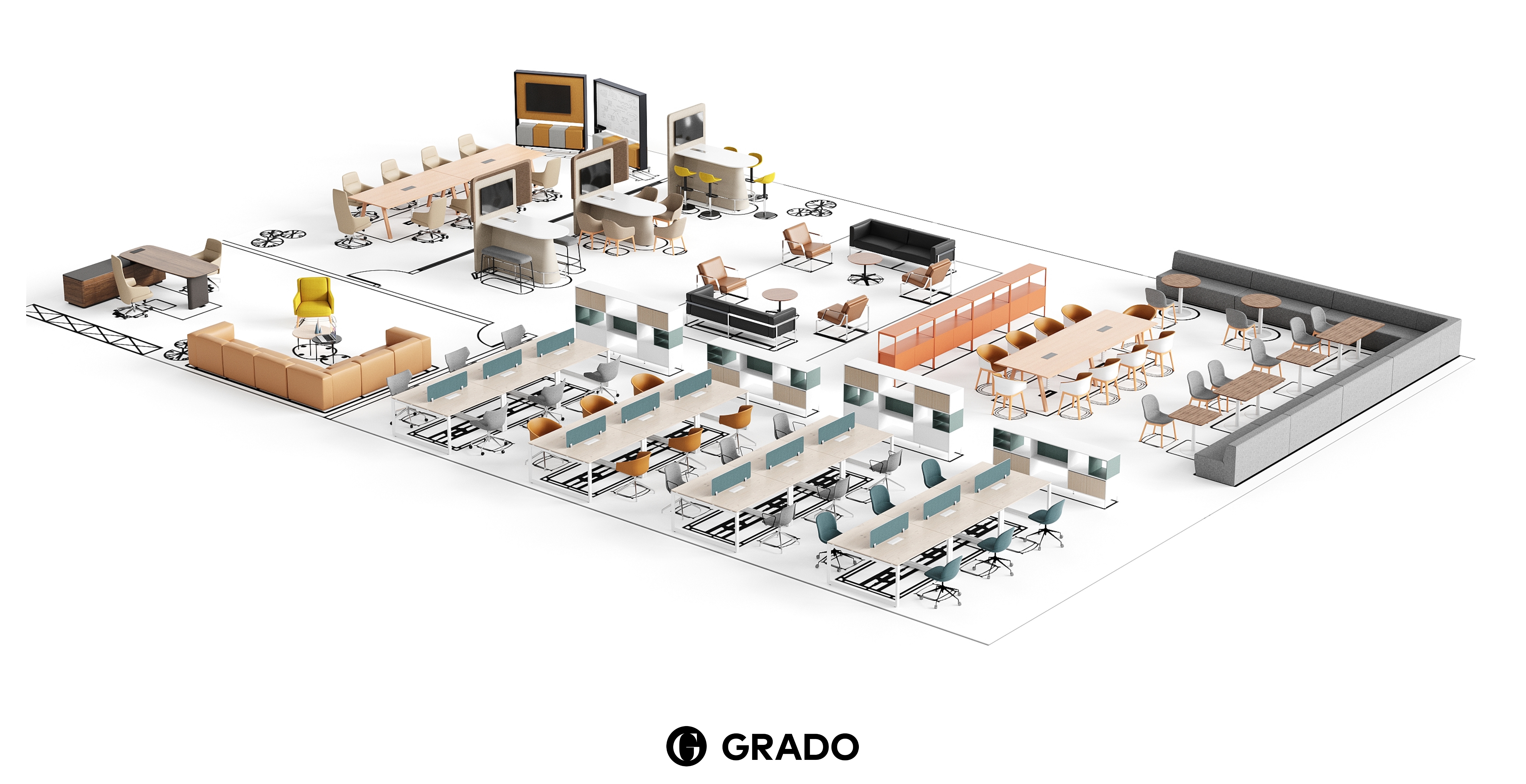 GRADO基于未来办公主题,为不同的工作场所目标设计独立和协作的工作模块。GRADO的区域划分策略包含现代开放式办公区,旨在促进团队合作与沟通,同时保留个人工作空间。一张大桌子和四把可调节的办公椅,适合小团队合作;模块化储物柜用于存放个人和团队物品;以及一个配有沙发和高咖啡桌的休息区,鼓励团队进行非正式互动。此外,还为需要专注的员工提供的独立工作站,配备个人办公桌、符合人体工程学的椅子、储物柜、隐私屏风和隔音工作站,确保工作不受干扰。展厅还设有一个协作与灵活会议区,提供多功能的会议和协作空间,包括可扩展的会议桌、移动会议椅、白板、投影设备和移动储物柜。更有专门的区域,如健康站立办公区、远程工作支持区、私人办公室和社交互动区,每个区域都根据其特定用途进行配置,以满足多样化的工作需求和偏好。