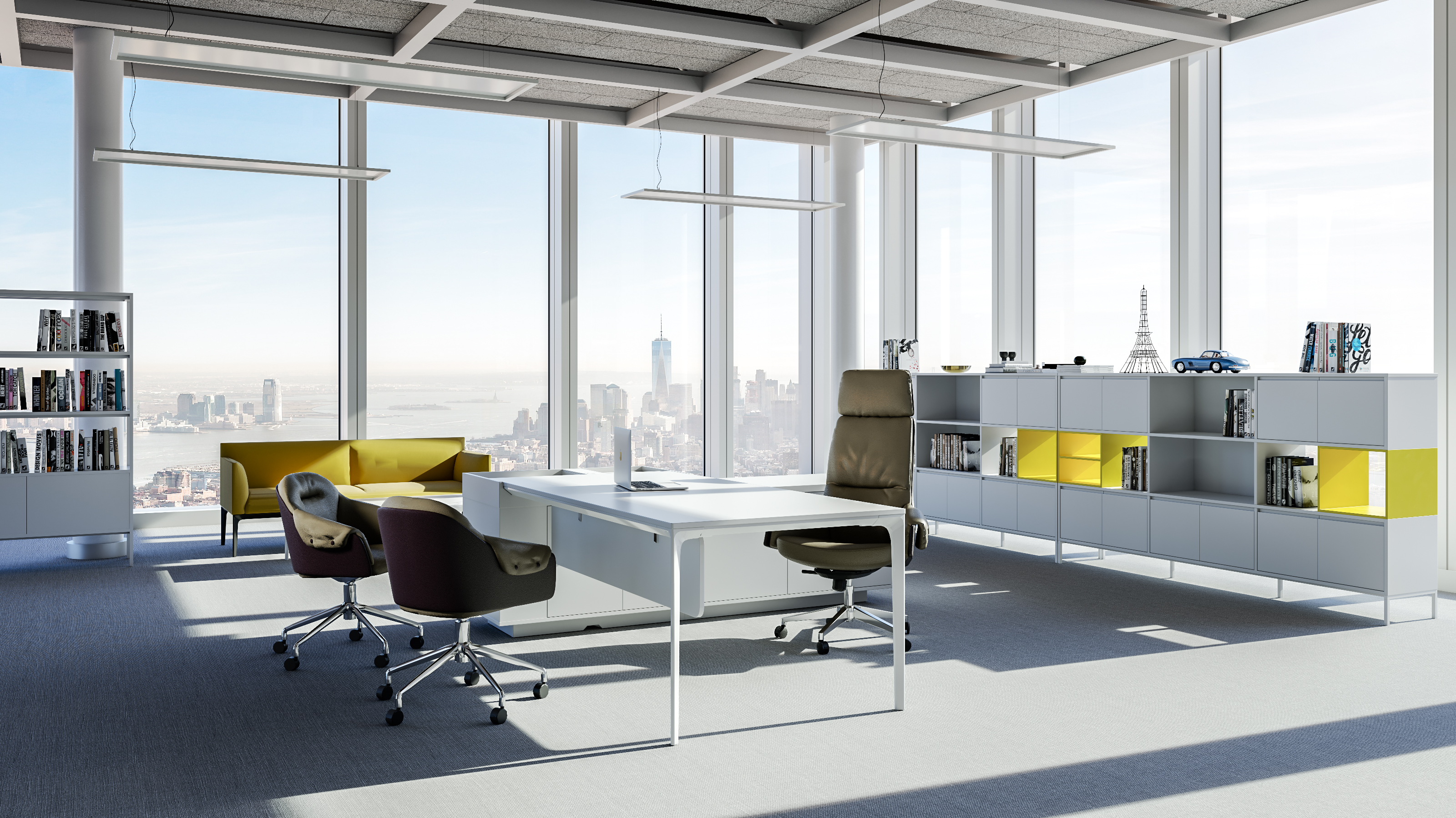 菲迪沙发的灵活扩展性使得CEO的工作空间得以延伸,通过在尾部增加模块,让更多员工能够参与到解决问题的过程中。而嗒嗒主管桌与高背提琴椅的组合,则能够强化决策者的权威感。触手可及的储物柜以及位于蝴蝶休闲椅旁的鹅卵石桌,进一步提升了空间的人性化设计。