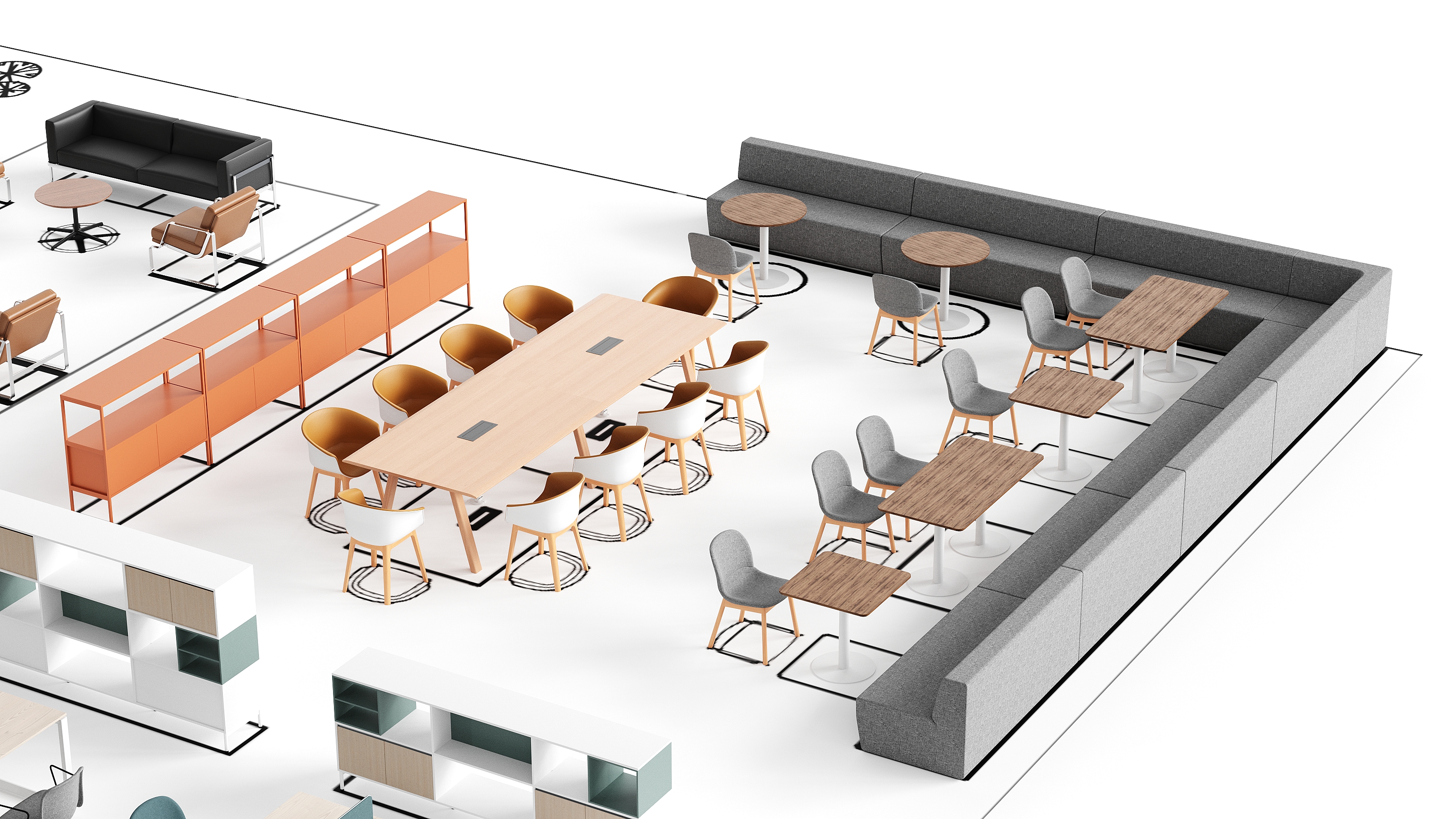 左上角的重点区域特别展示了四把小提琴椅和一张八字会议桌的排列,这一布局非常适合管理层会议。行者屏风配备了媒体设备,便于进行生动的视觉展示。此外,裙摆视讯桌扩展了团队会议空间,可以选择搭配高度可调的女王吧凳、悠悠长凳或贝壳椅。这些灵活而智能的组合能有效满足数字工作领域内的策划和专注策略的需求。在另一侧,经典的黑色皮革外壳潘多沙发和充满光泽的洛克椅,与橡木贴面的锐桌相搭配,共同构建了一个专业的咨询和谈判区域,适合专家在此做出重大决策。