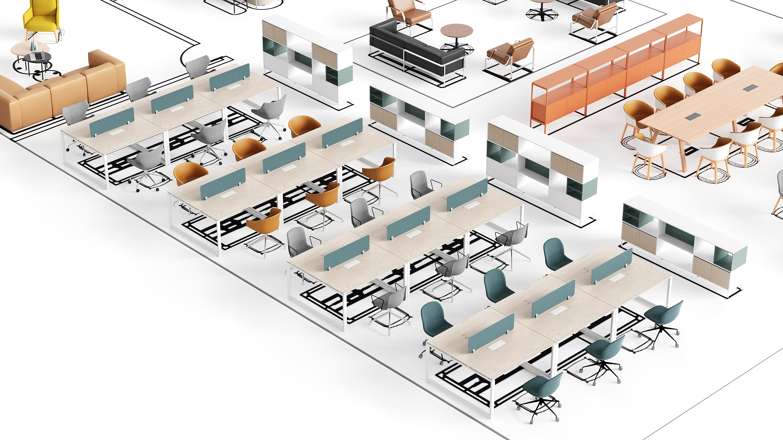 模块沙发仅使用基本的纺织品,简单勾勒出工作区域的轮廓。内部坚固而富有弹性的泡沫填充了平面,既可以作为座位区也可以作为较低的桌面使用。木质底座的爱沃椅与几何桌相对而设,共同构成了一个随性的私密工作空间。然而,围绕八字会议桌摆放的较为非正式的女王椅,通过一旁的橙色钢管制成的系统钢柜与隔壁的洽谈区分隔。