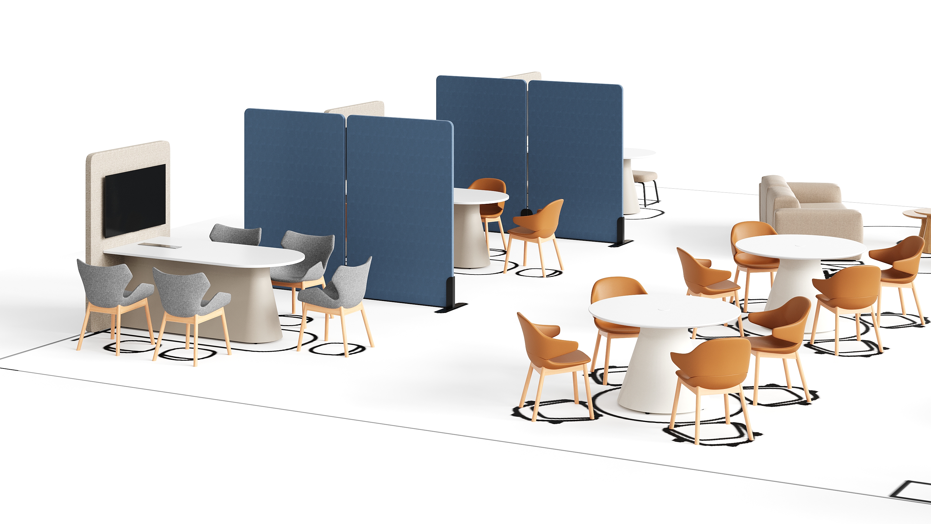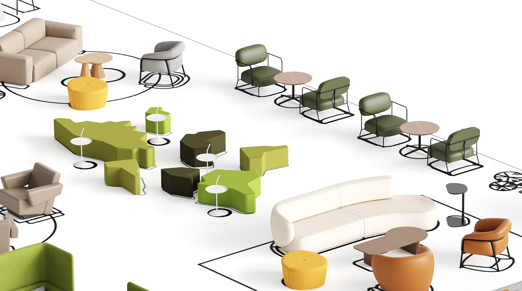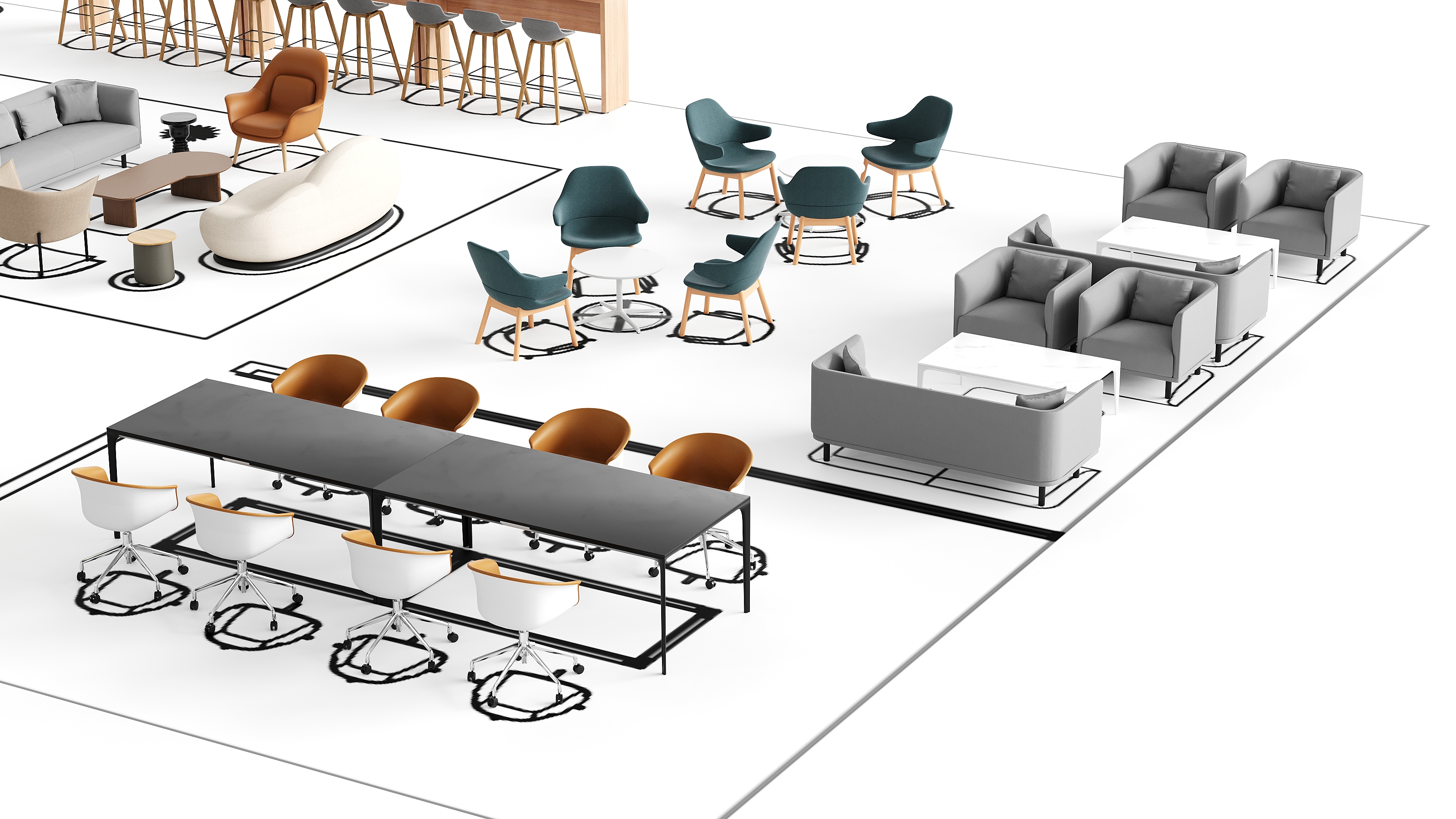 在会议室区域,推荐沿着走道布置贝壳餐椅,并与八字桌搭配使用,以满足大型企业的需求。元宝沙发所代表的模块化系统因其可扩展部件而能更灵活地适应不同大小的房间。此外,方块墩和锐咖啡桌可用于放置记事本或其他资料。对于需要私密对话的场合,模块沙发 S系列的独立模块可以创建一个集中的交流区域。这些布置为协作空间带来了高度的灵活性和专业性,能够根据不同的需求提供定制化的解决方案。