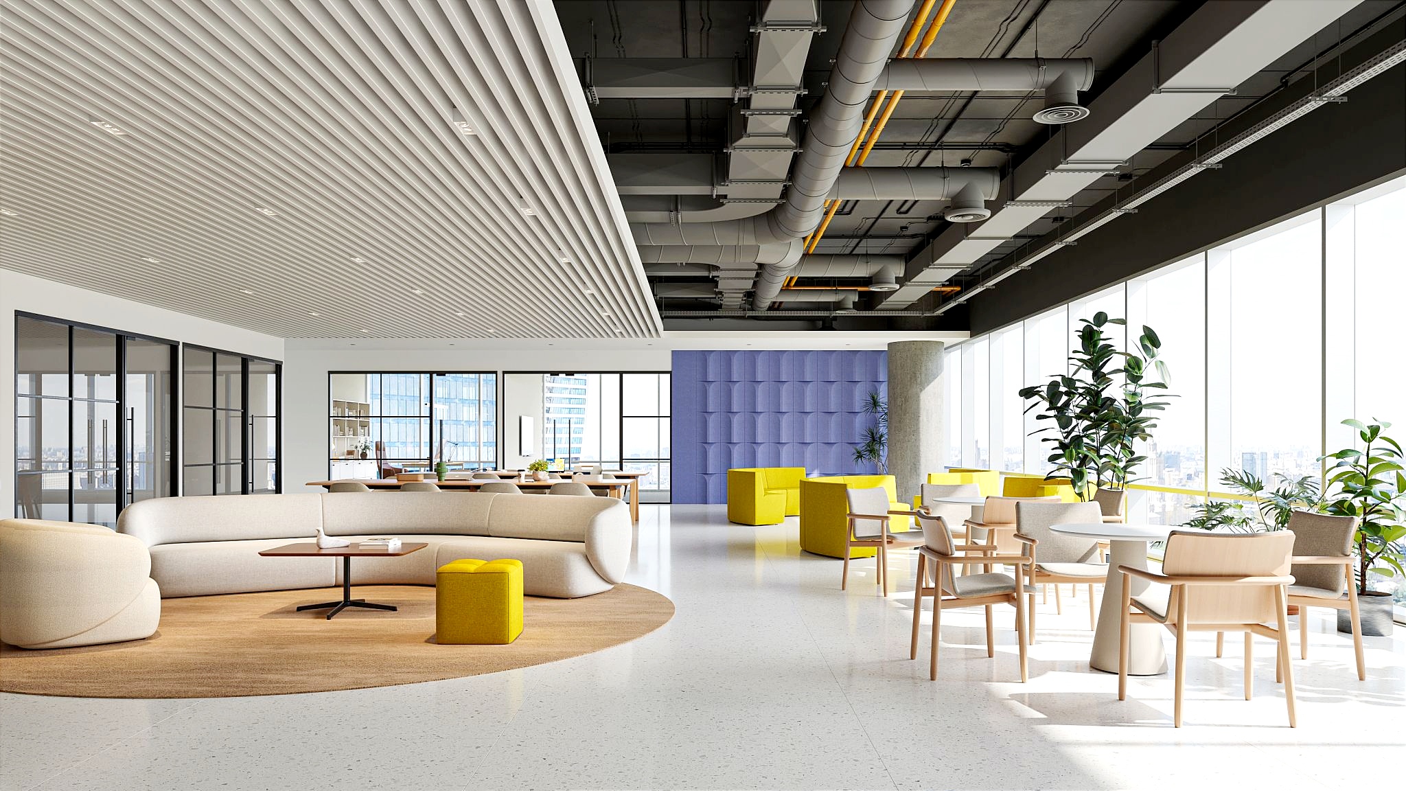 在协作式共享工作空间的接待区、交流区和谈判区,家具和设计元素的布局旨在打造一个既专业又灵活的环境,以适应多样化的需求。这个区域涵盖了会议室、谈判中心以及分散的小型工作坊,每个区域都设计有不同的重心和人流量承载能力。