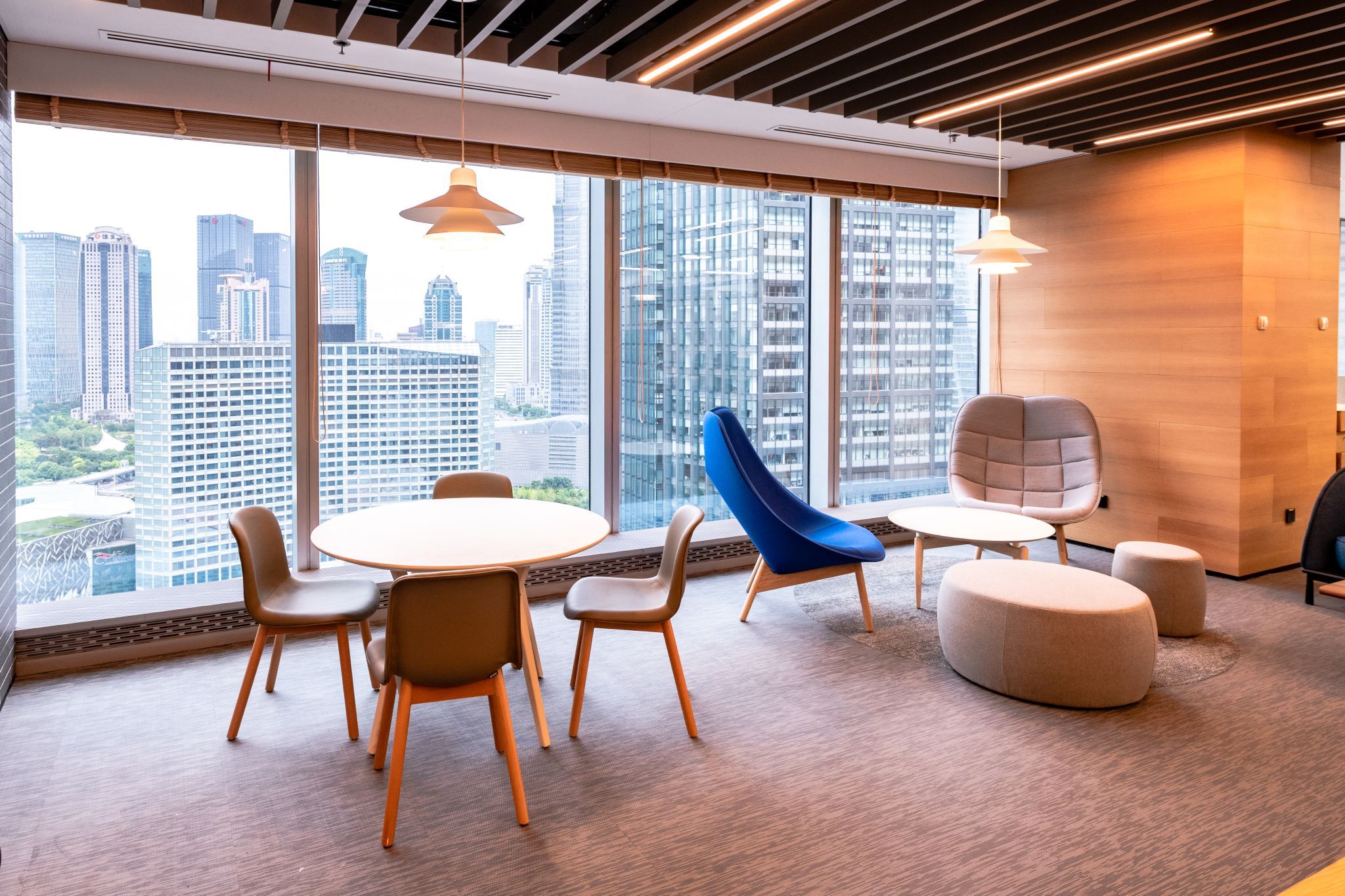 项目 | 周边谈话区_Datacom 大胆地采用了深红色外壳的贝利休闲椅在过道拐角处,给人以强烈的视觉冲击