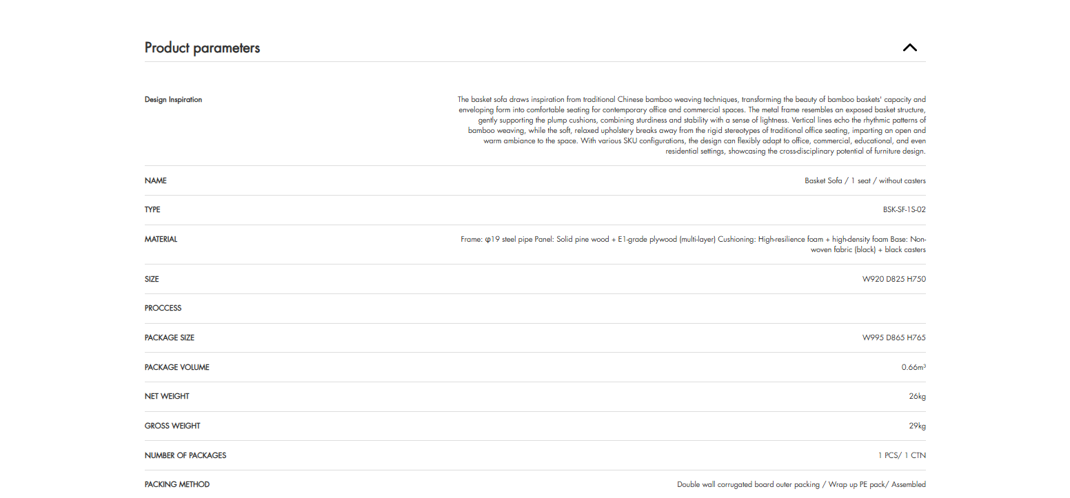 · Detail: Product specifications, dimensions, materials, weight, and other technical details.