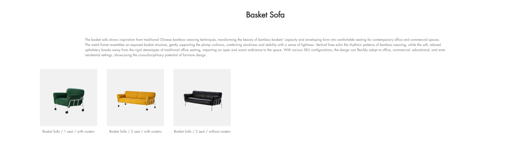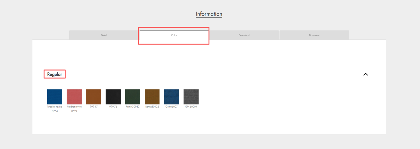 · Color: Showcases the recommended fabric and color options for the product.