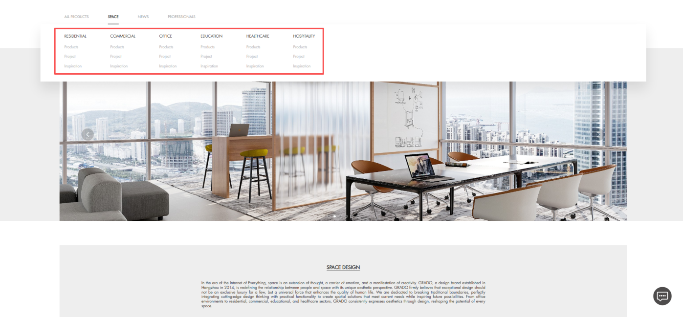 G-GRADO’s Spaces section showcases projects, products, and news across six types: residential, office, commercial, education, healthcare, and hospitality, offering a visual guide to space planning.