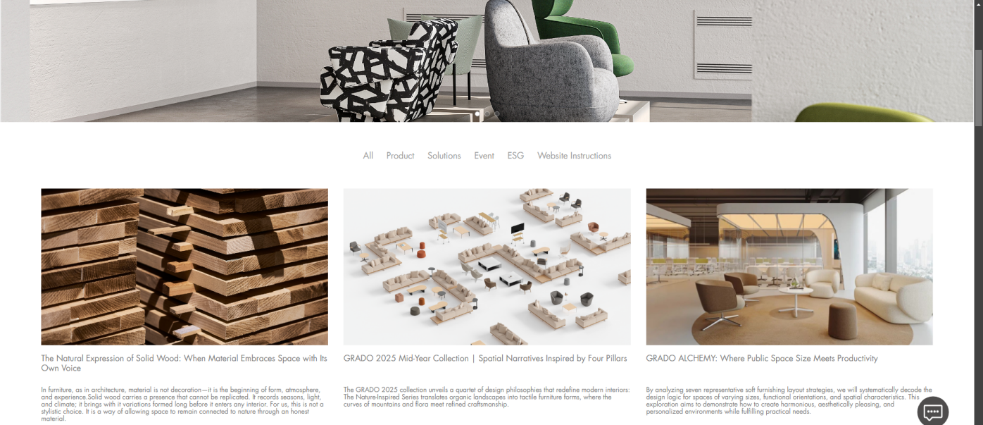 The News page focus on product launches, single-item highlights, brand updates, industry trends, and space solutions. Category tags at the top help users quickly filter content of interest.Registered users will automatically receive news updates via email, keeping them informed of the latest brand developments. Related product links are included at the bottom of each article for easy access to relevant product information.