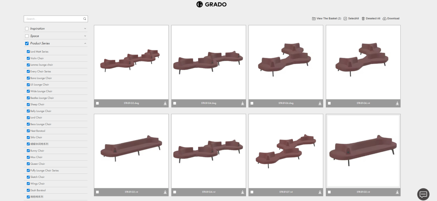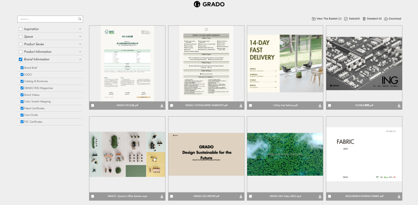 · Downloads: A resource hub for designers, offering product models, white-background product combinations, and space styling references to support efficient design workflows. Brand materials such as fabric swatches and brochures are also available for a quick overview of G-GRADO.