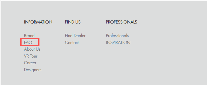 Click FAQ at the bottom of the homepage to find answers to common questions, including purchasing, customization, delivery, and installation.