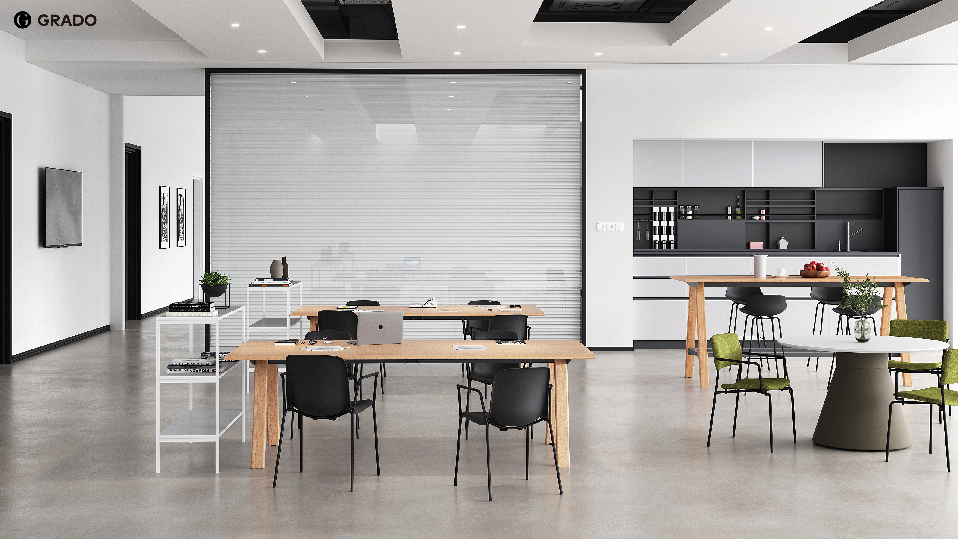 Office Space Arrangements: Bold Color Contrast with Black Elements