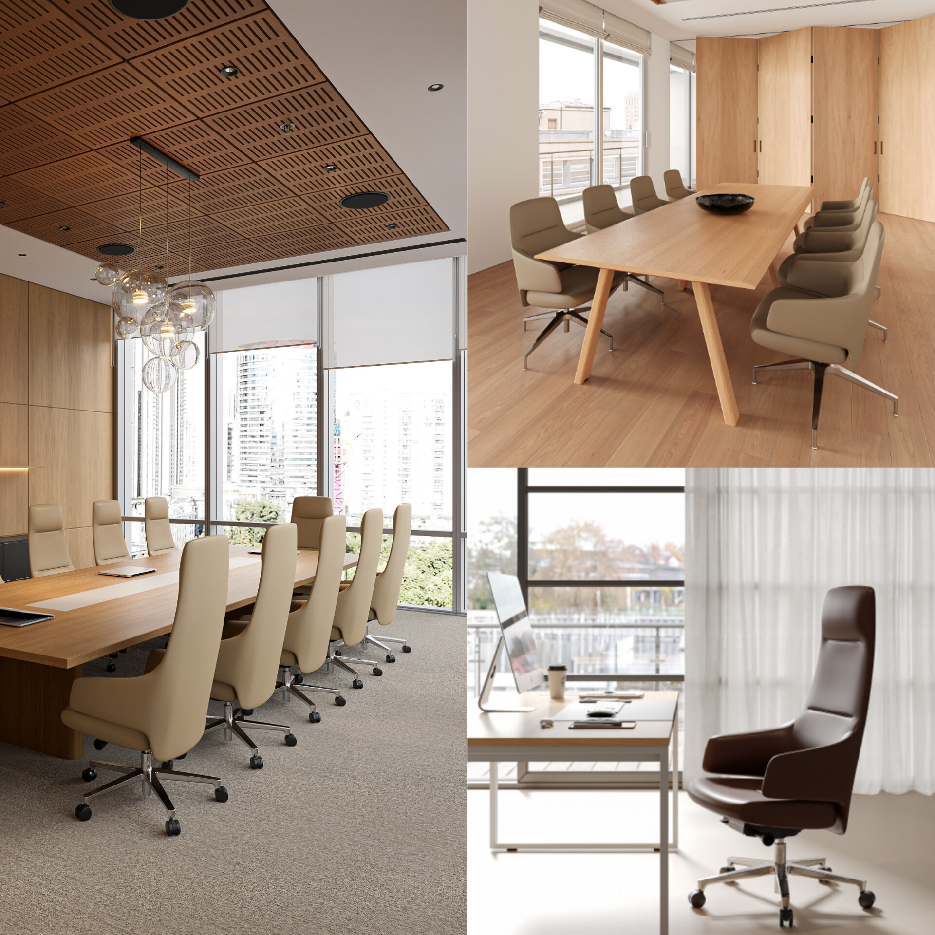 - Executive meeting space: High-back violin chairs in a five-star base with wheels provide flexibility for meeting communication, and the smooth curves make the entire meeting space more elegant and spacious. High-back violin chairs can provide users with maximum comfort and support, ensuring that they do not feel tired or uncomfortable during long periods of sitting. They also provide a comfortable and efficient meeting environment for a space that accommodates 10 to 12 people.