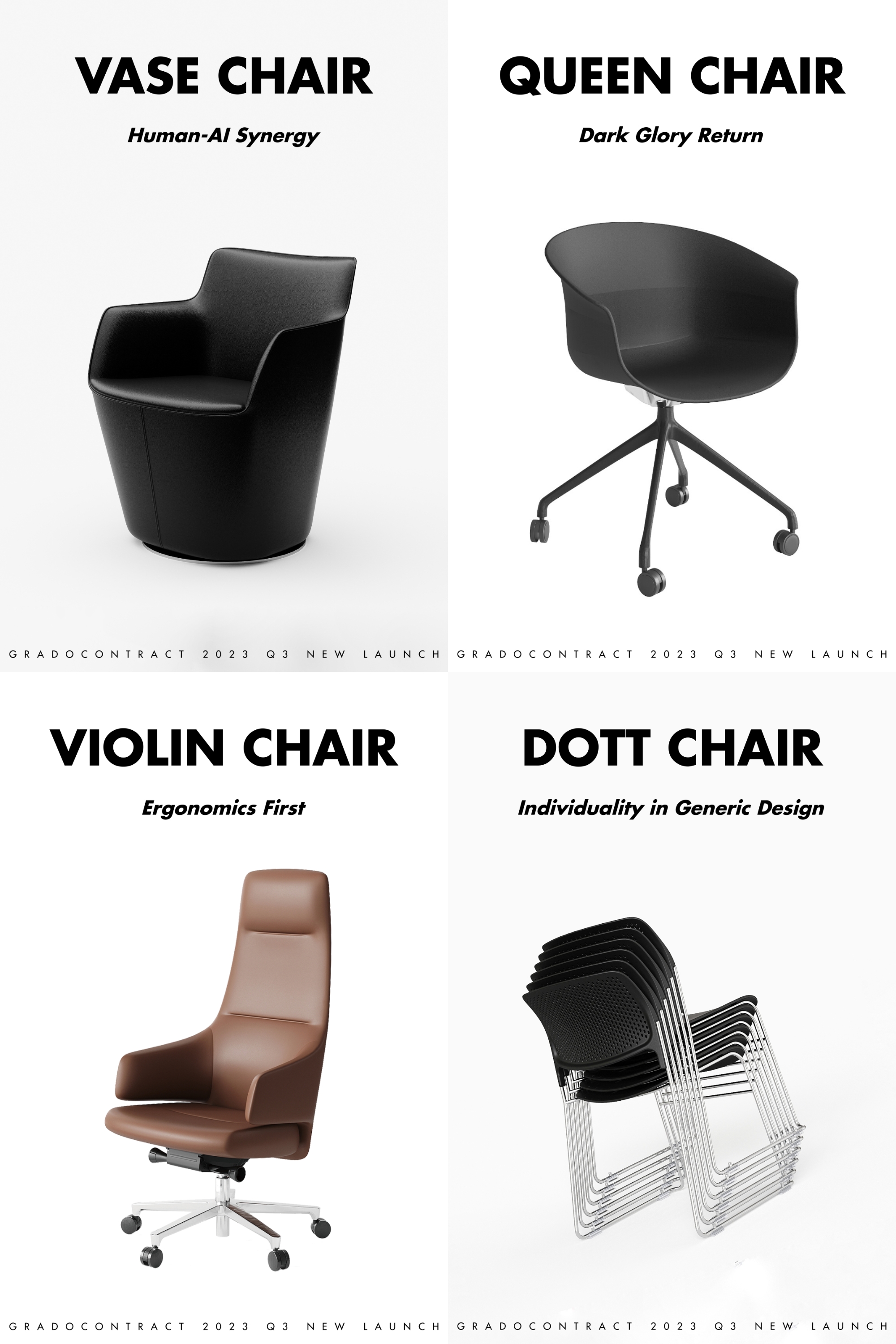 FOUR chairs make their debut as a collection to wind up Grado 2023 Q3. The Queen Series and Every Series showcase the return of classic dark glory adding sophistication to any space. The Vase Chair exemplifies the potential of AI in updating legacy designs and exploring new possibilities and iterations. AI algorithms analyze user data to optimize comfort, proportions, and sustainability while preserving the creative vision of human designers. The Dott Chair innovates generic design going beyond learning environments and proves that training chairs can be the ideal fit in resting, dining, and reception areas. The Violin Chair demonstrates the graceful curves of a violin's strings and the sleekness of the Streamline Moderne style.