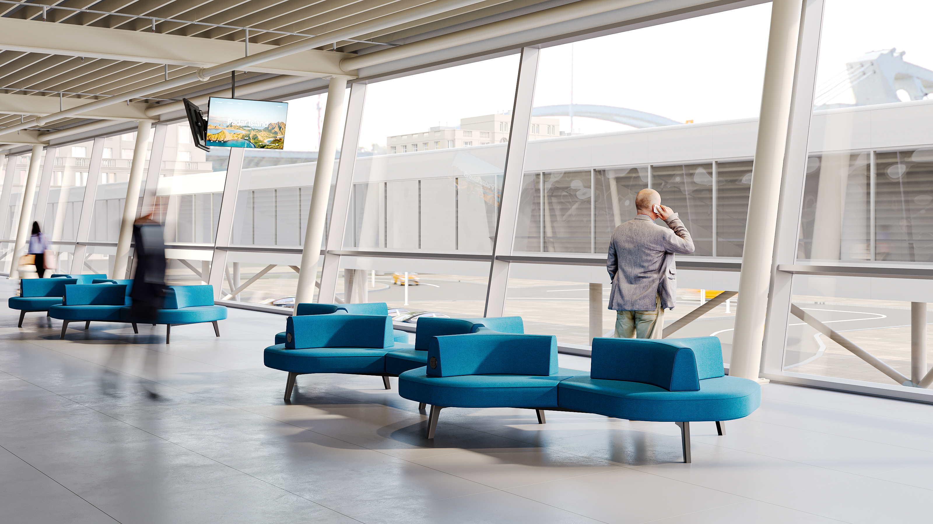 Shared Waiting Zones: Curved sofas and side tables adapt from intimate pairs to groups of six, inviting relaxed interaction among passengers with time to spare.