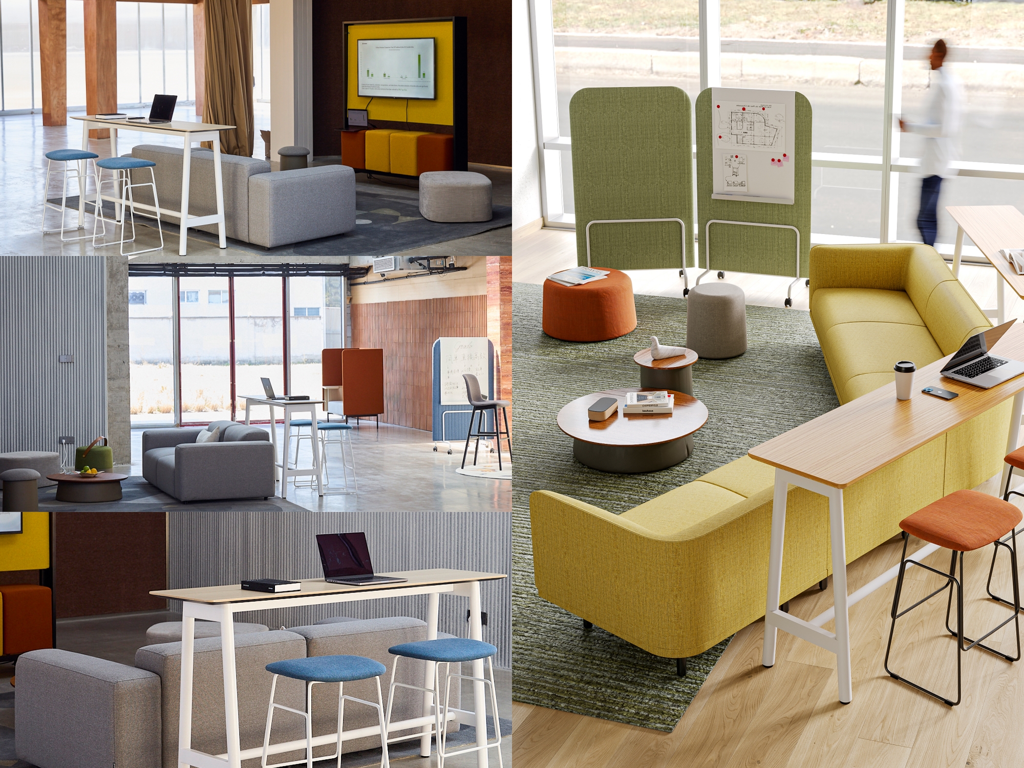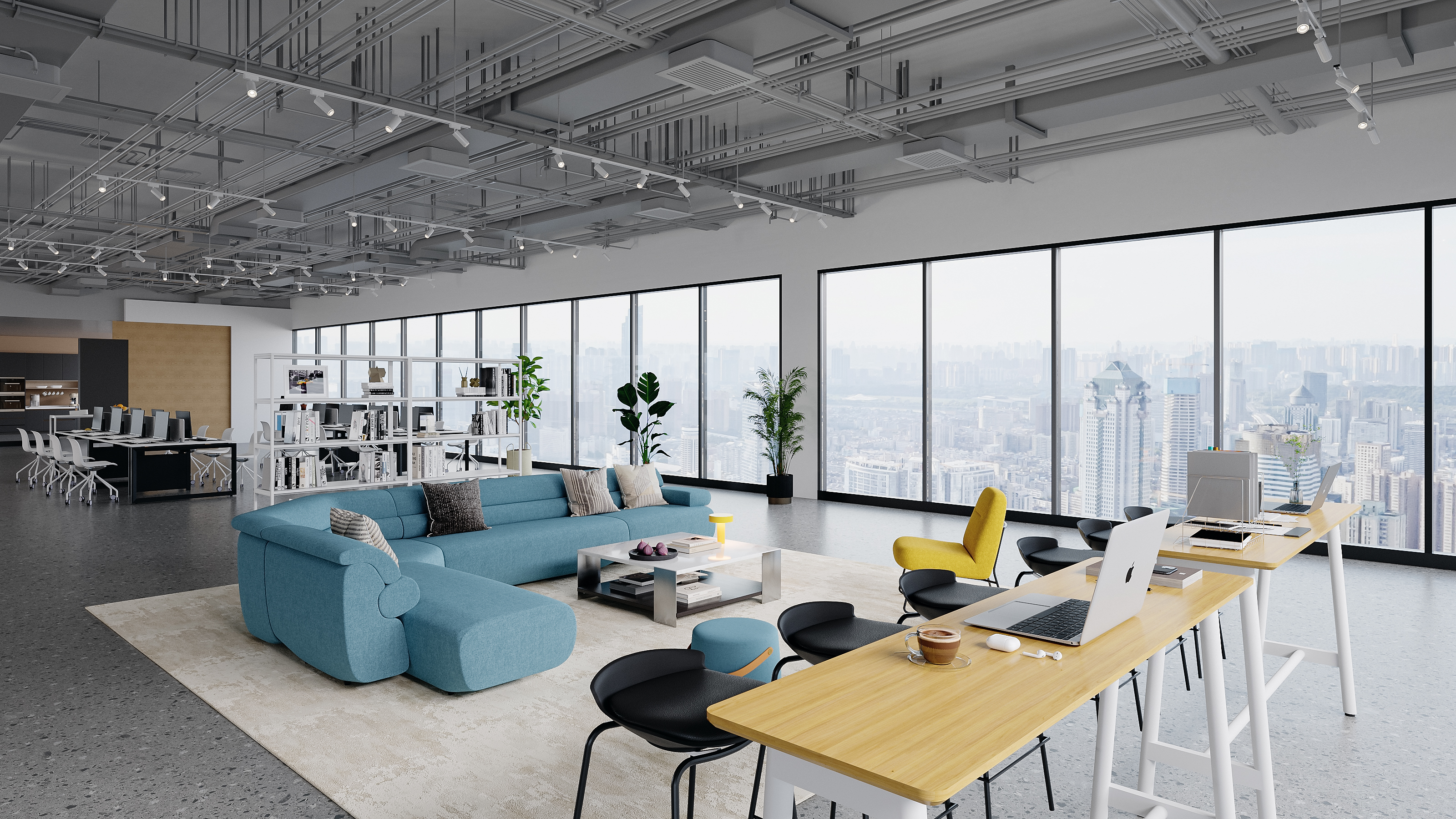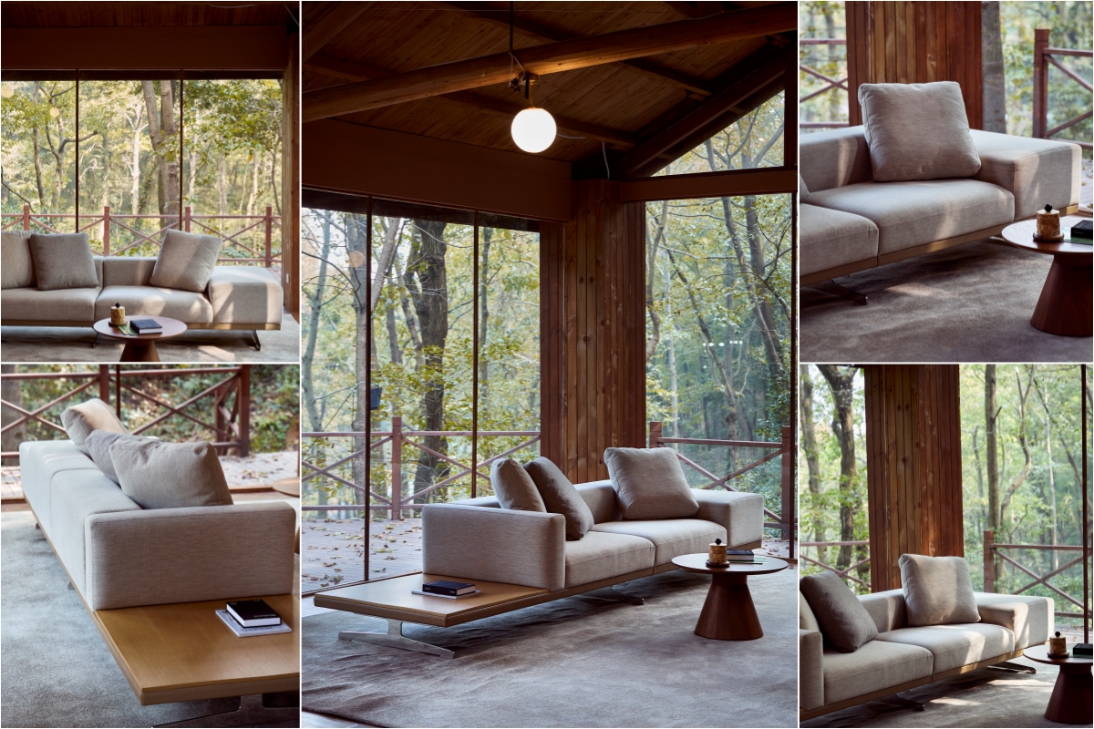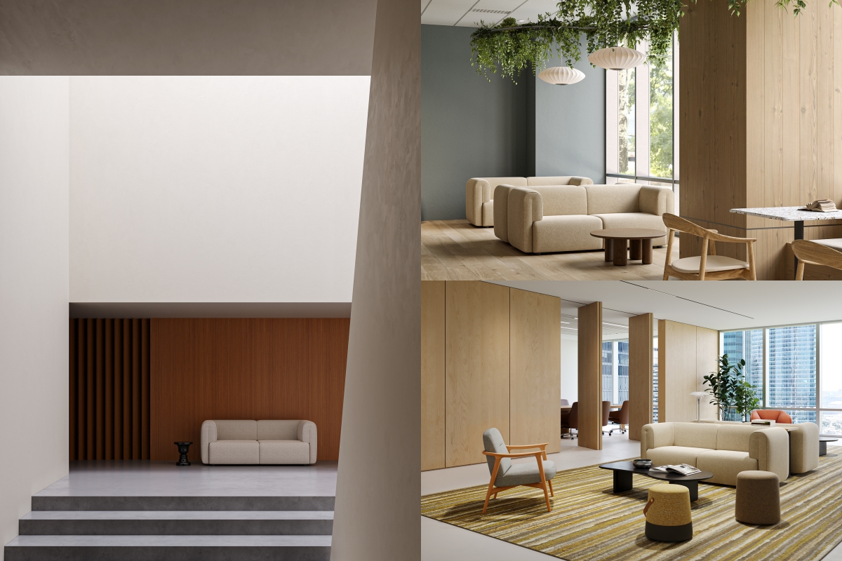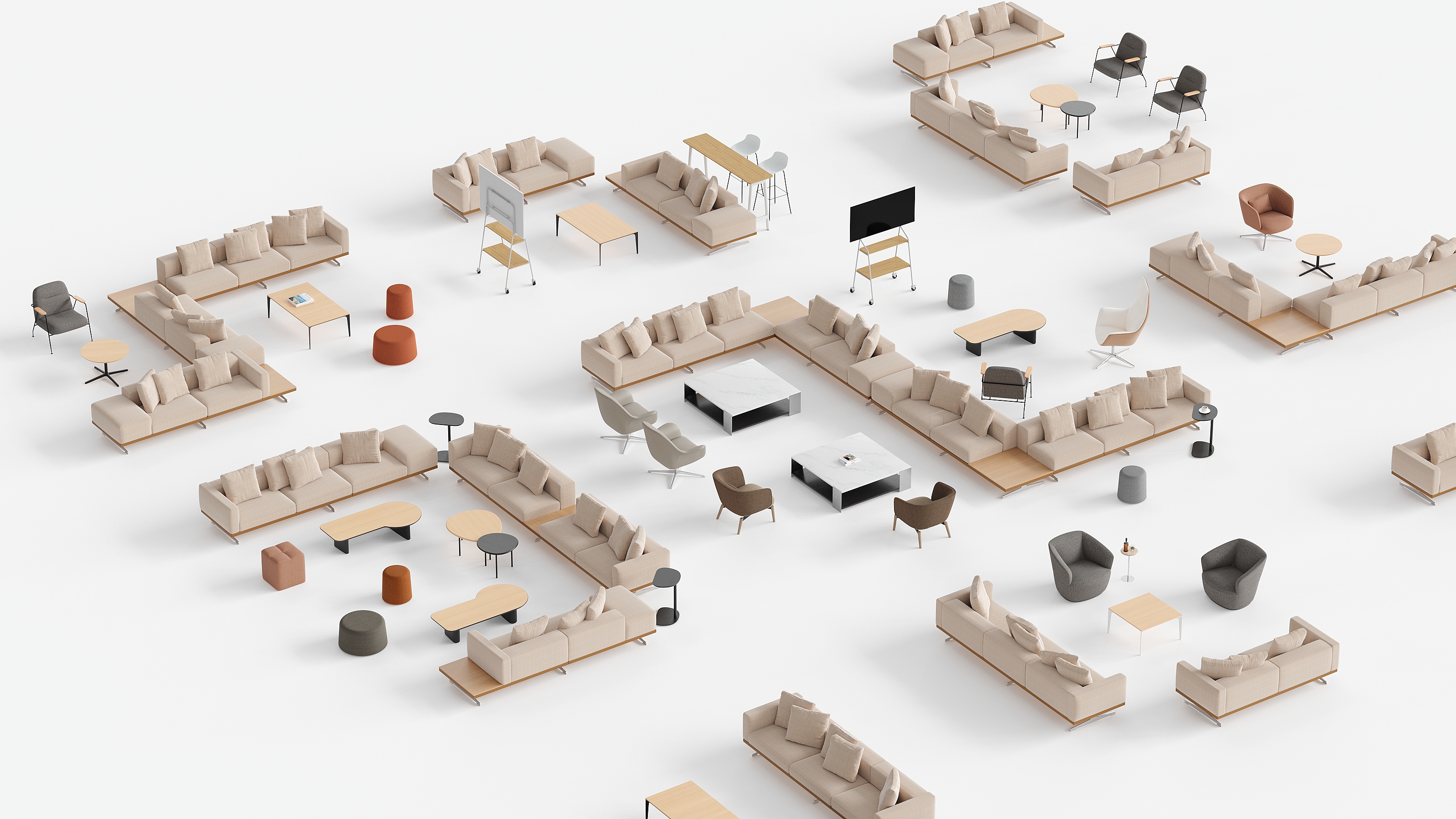 A harmonious fusion of flexibility, aesthetics, and comfort, this sofa creates self-contained "functional islands" where plush seating seamlessly integrates with ergonomic worksurfaces.