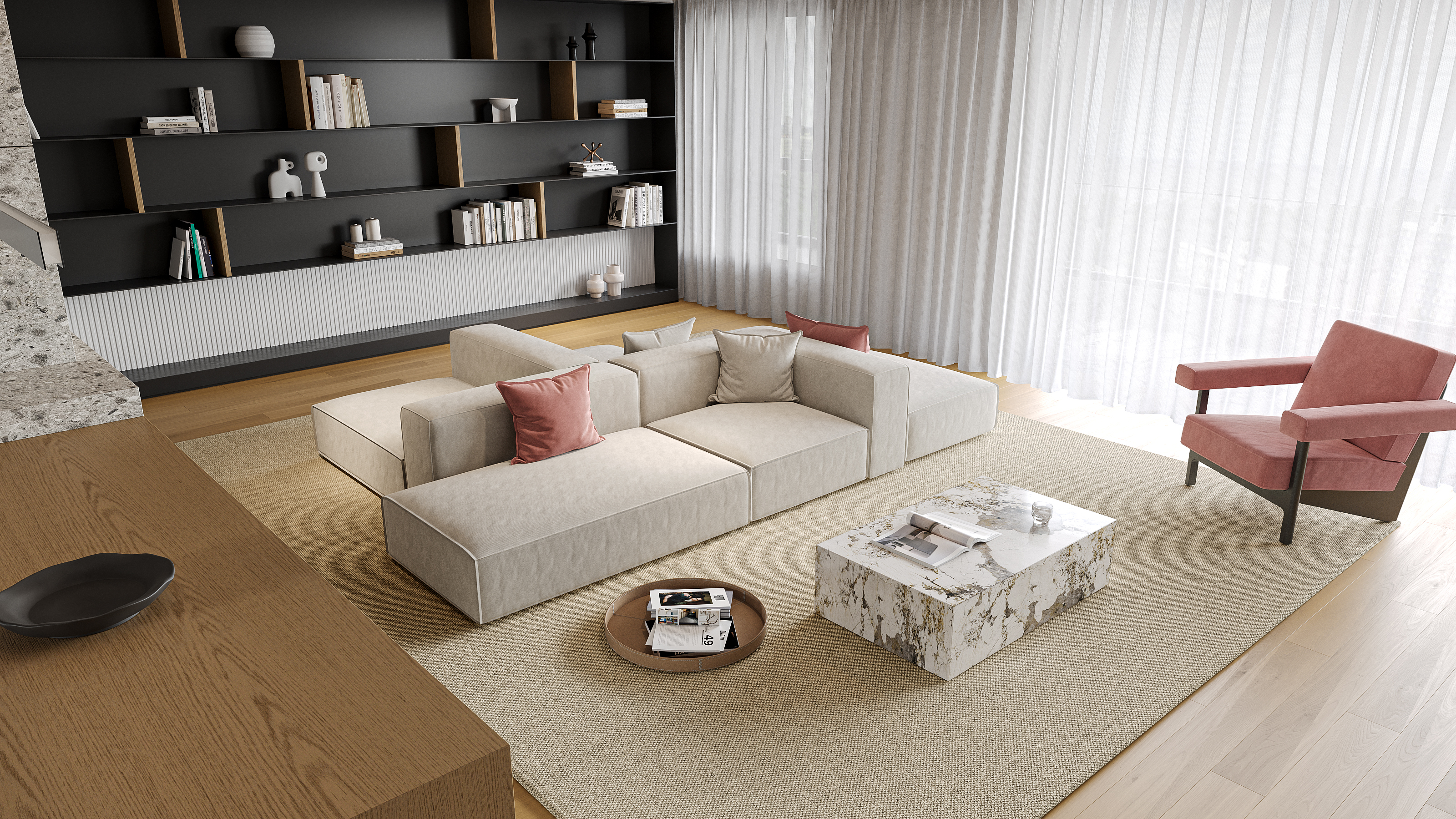 Reinterpreting the concept of breadth through refined dimensions, the H Sofa achieves perfect balance between compact scale and generous comfort.
