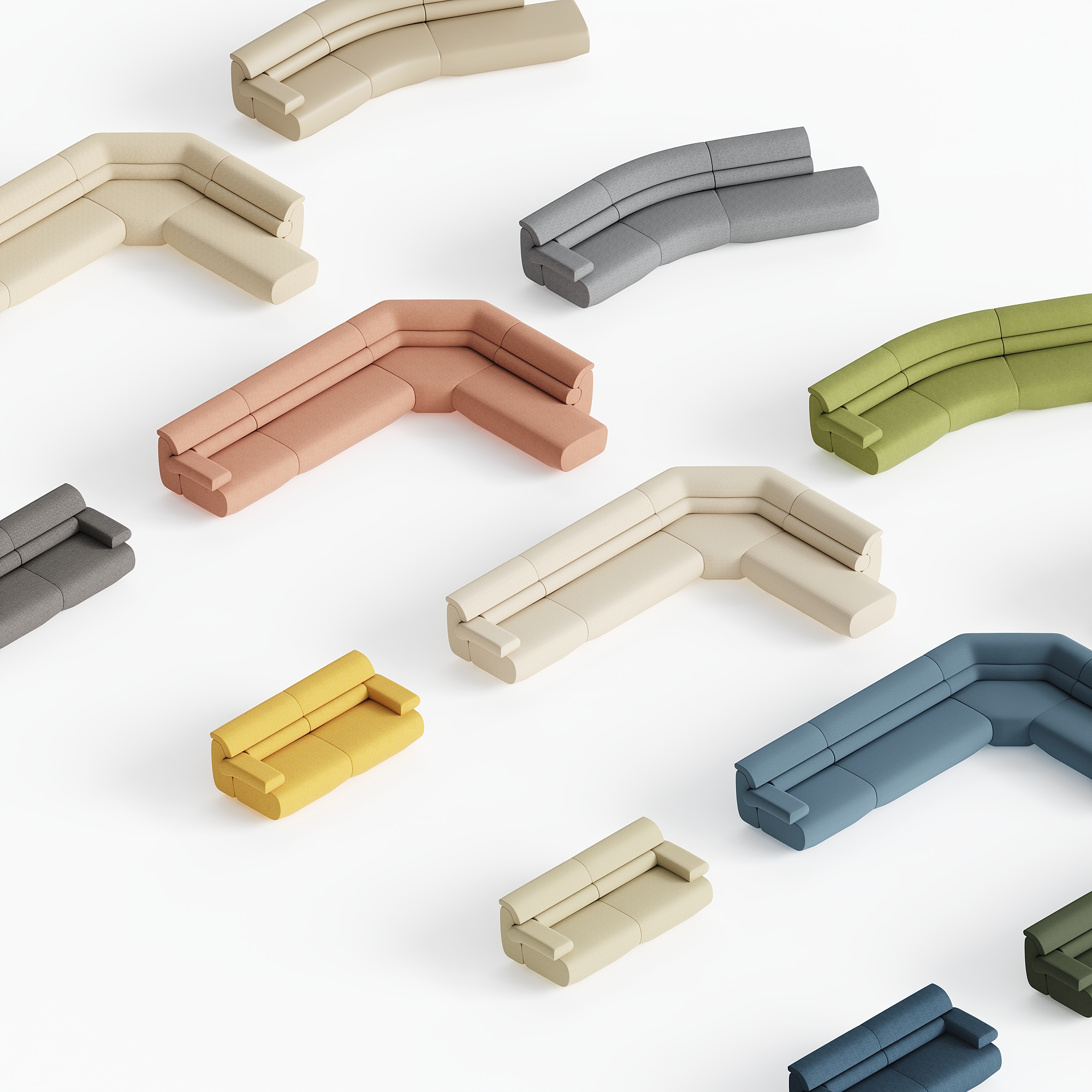 Eight modular arrangements adapt from social hubs to private retreats, while integrated power outlets cater to modern workplace needs, ideal for hotel lounge zoning without physical partitions, co-working space breakout areas, and executive office waiting zones.