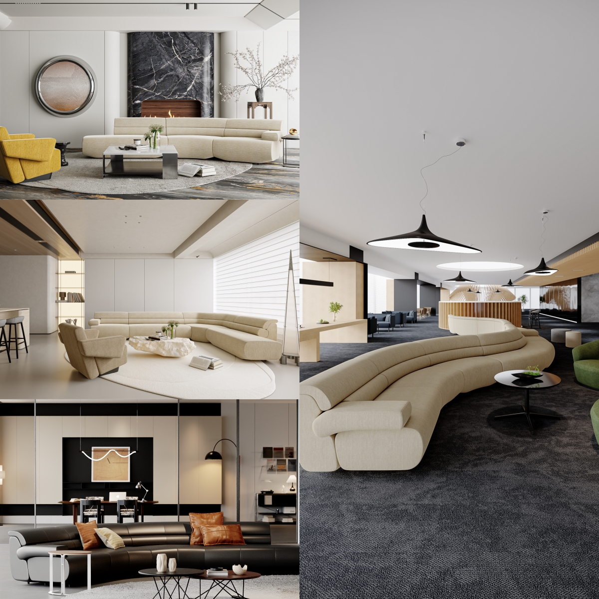 High-resilience foam maintains crisp silhouettes while offering cloud-like comfort. Extended seat bases with reinforced front edges allow carpet-level lounging. Curved modules soften reception areas; linear units bring order to open plans. Complement with raw timber or stone-top tables to amplify organic harmony.
