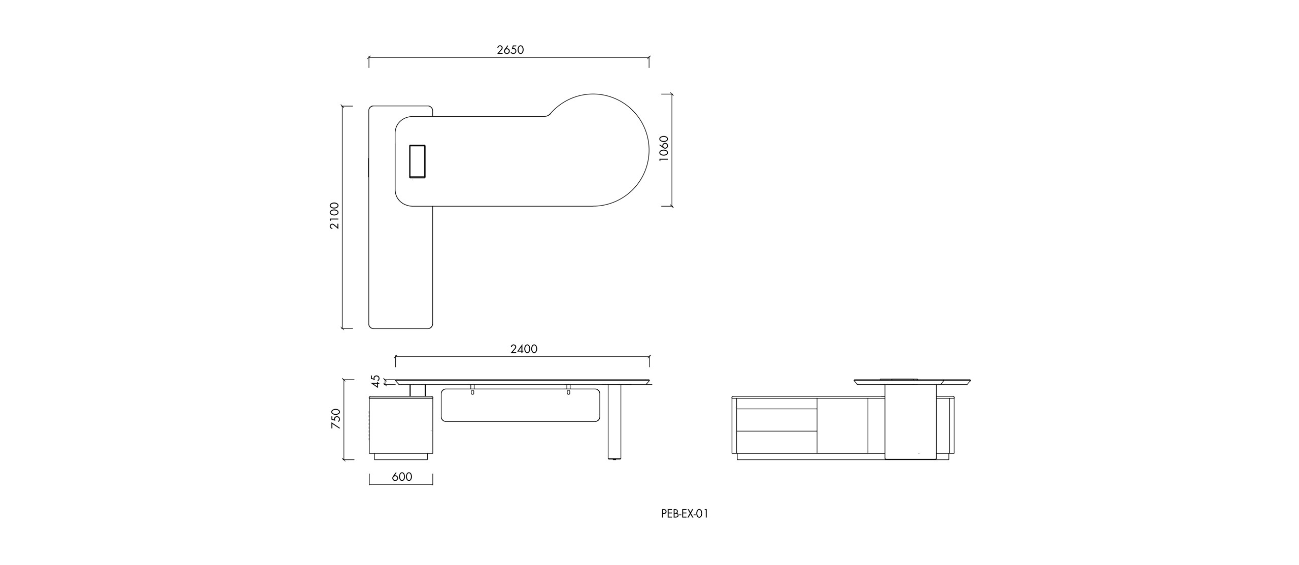 W2650 D2216 H750 desktop Size:W2400 D1060 H45 Cabinet size:W2100 D600 H600