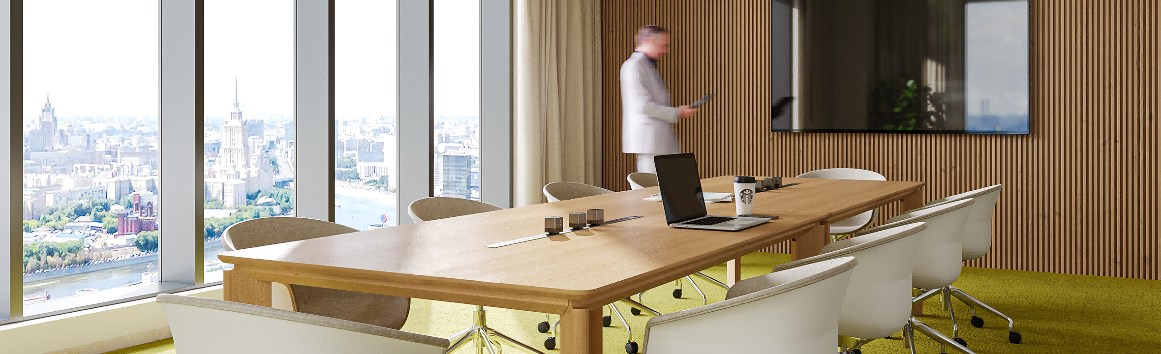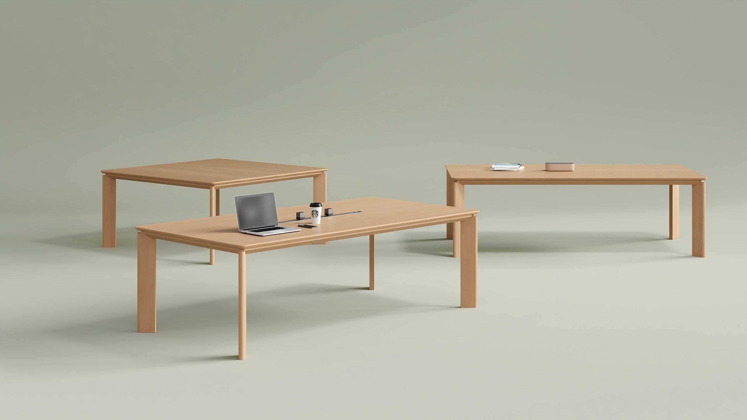 Made in solid ash wood with warm grain and tactile comfort. Slim, stable legs for a light presence. Magnetic covers and built-in power keep cables concealed. Supports a neat, efficient workspace. Available in multiple sizes (W2000–2400, D1000–1200). Adapts easily to small meetings, standard conferences, or large workshops. Full solid wood construction for greater strength than standard boards. Eco-certified materials meet corporate sustainability requirements. Longer lifespan reduces overall operational costs.