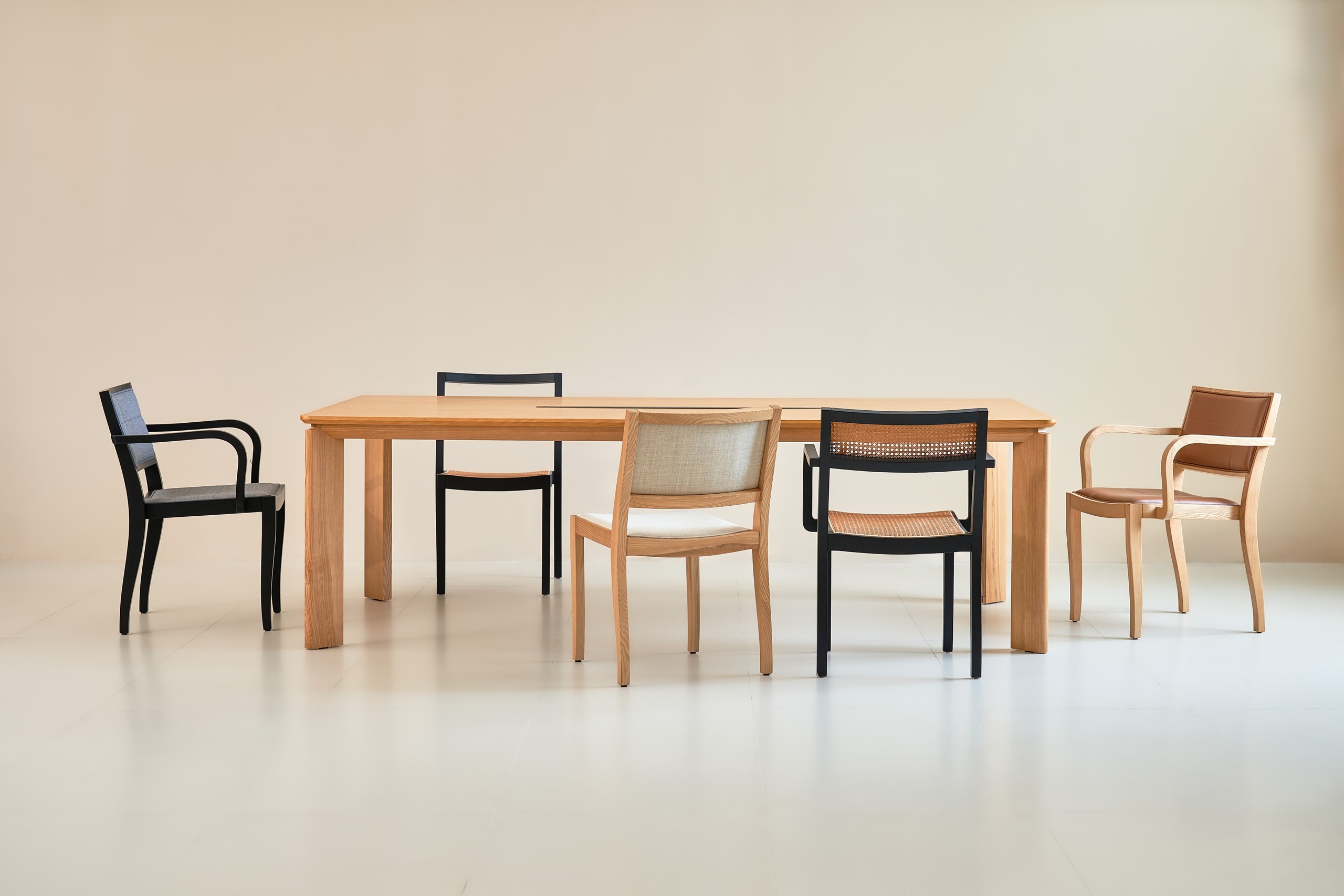 Architectural minimalism、Solid wood elegance、Hidden cable management — unified in one table.The Gate Table acts as an architectural anchor for modern commercial spaces. More than a conference table, it balances design presence, spatial adaptability, and refined usability—a solution seeking both style and function.